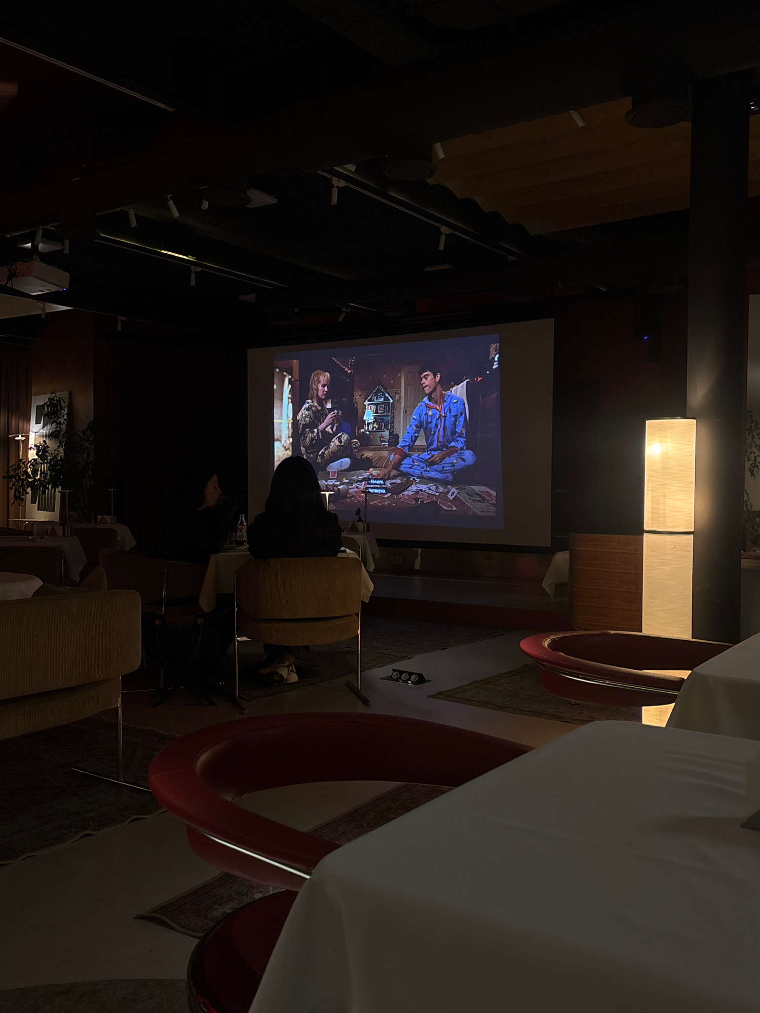 A gathering of people is watching a movie projected on a screen indoors. The scene is in Yerevan, Armenia. The projector is positioned to show the movie on a large screen. Several individuals are seat…read more