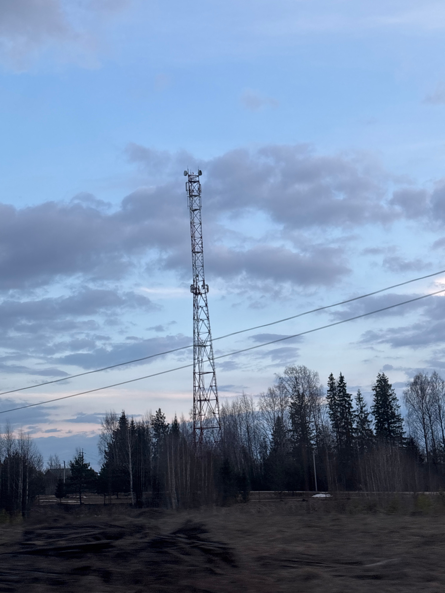 The image shows a tall metal tower, likely a communication or transmission tower, against a cloudy sky. Power lines run across the sky. A line of trees is visible in the background. The foreground app…read more