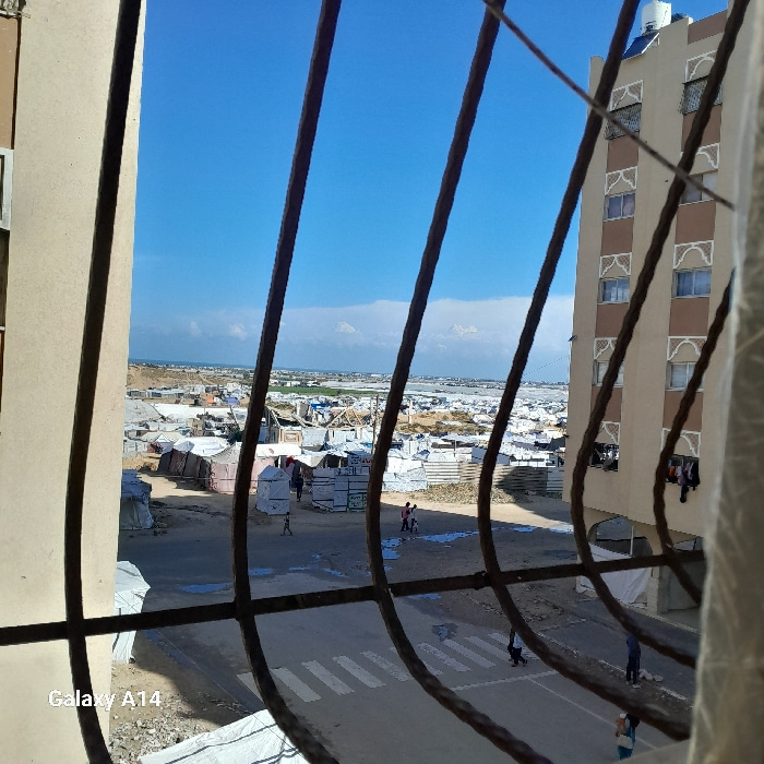 The image depicts an elevated view of a densely populated area in Khan Yunis, Palestinian Territory, seen through a set of rusty, vertical and horizontal metal bars. In the foreground, parts of two mu…read more