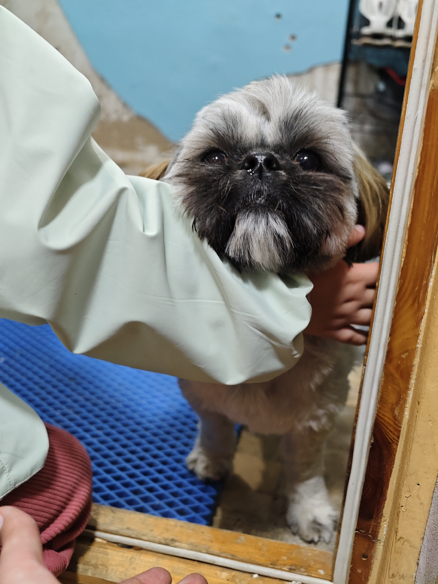 The image displays a close-up, eye-level view of a small Shih Tzu dog being held by a person in an indoor setting, likely a grooming area, in Chaikovsky, Russia. The dog is the central subject, featur…read more