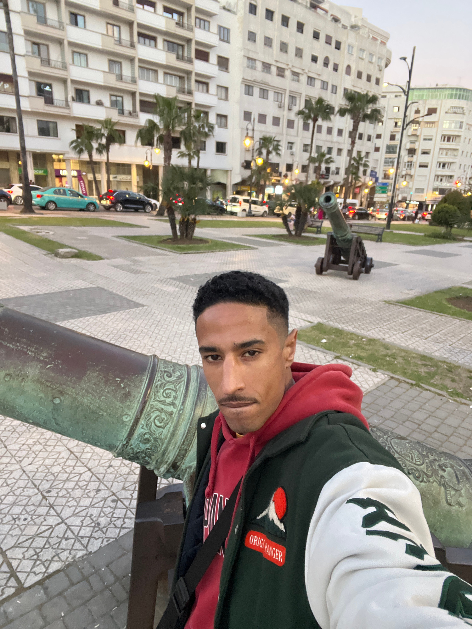A man takes a selfie with a cannon in Tangier, Morocco. The man has short black hair and wears a red hoodie under a green and white jacket. The cannon is made of weathered green metal. Behind them isβ¦read more