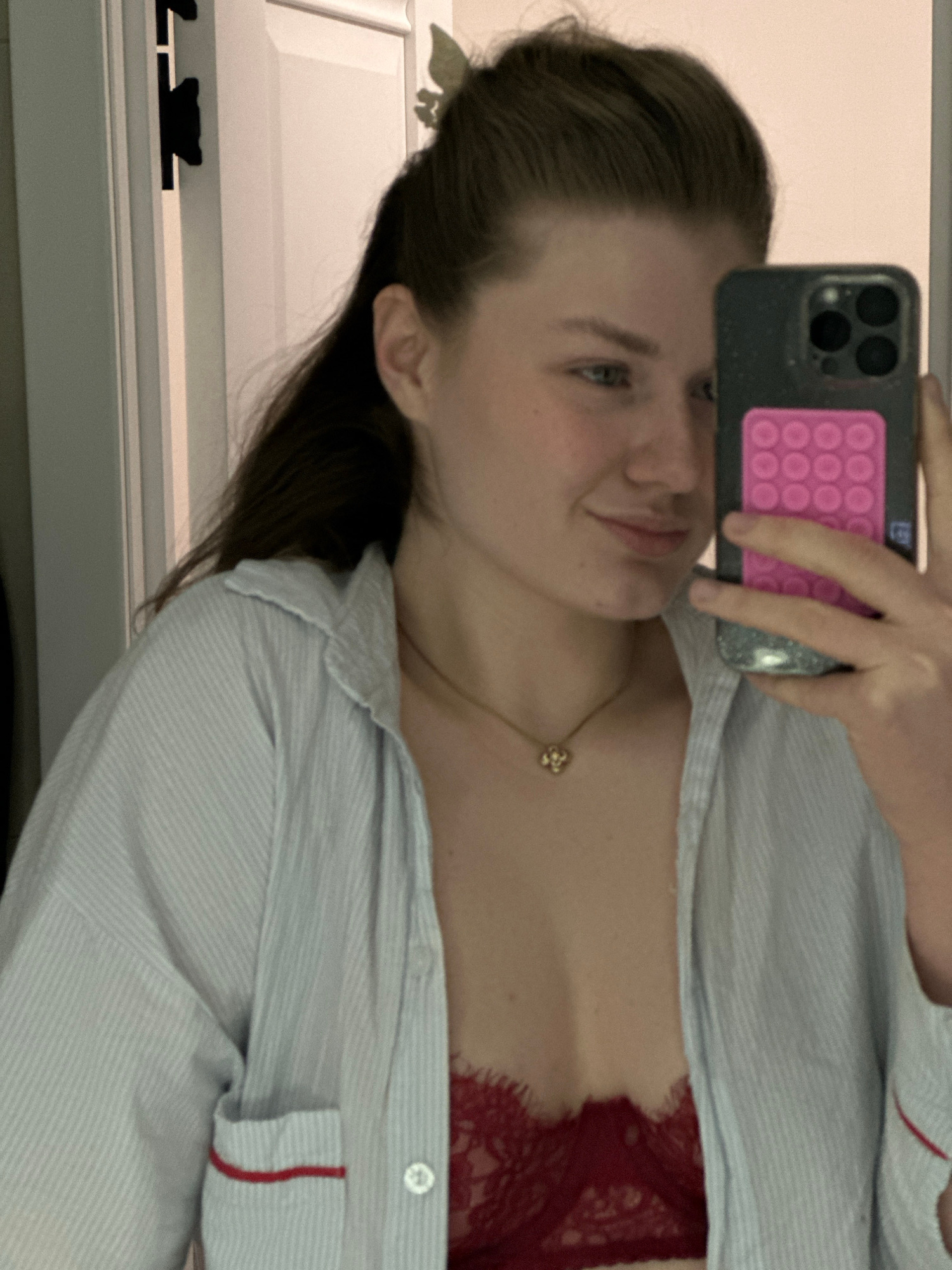 A woman is taking a selfie. She is wearing a light blue striped shirt with red trim on the sleeves. Underneath the shirt, red lace lingerie is visible. She is wearing a gold necklace. Her hair is pull…read more