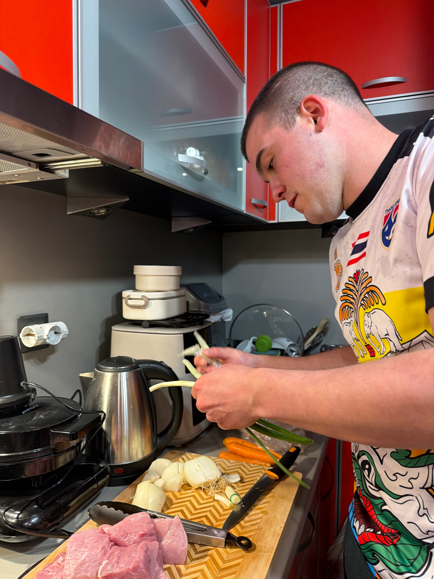 A person is engaged in food preparation in what appears to be a modern kitchen. The image is oriented with the person's head facing downwards and to the right, implying they are looking over a counter…read more