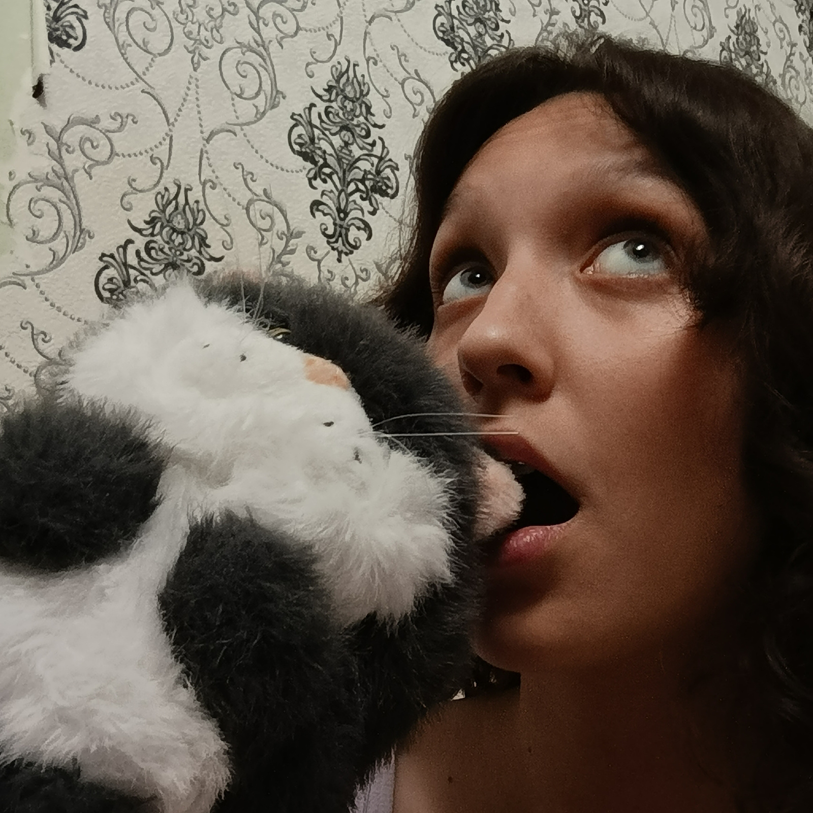 A close-up shot shows a young woman with light skin and dark wavy hair looking upwards with an expression of surprise or shock. Her mouth is slightly open, revealing the inside of her mouth and a bit…read more