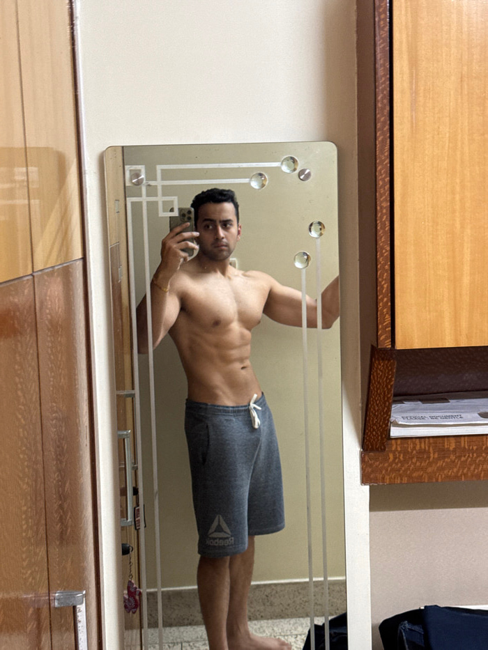 A shirtless man with defined abdominal muscles and wearing gray Reebok shorts takes a mirror selfie. He holds a smartphone in his left hand. The mirror has a decorative art deco-style frame. A wooden…read more