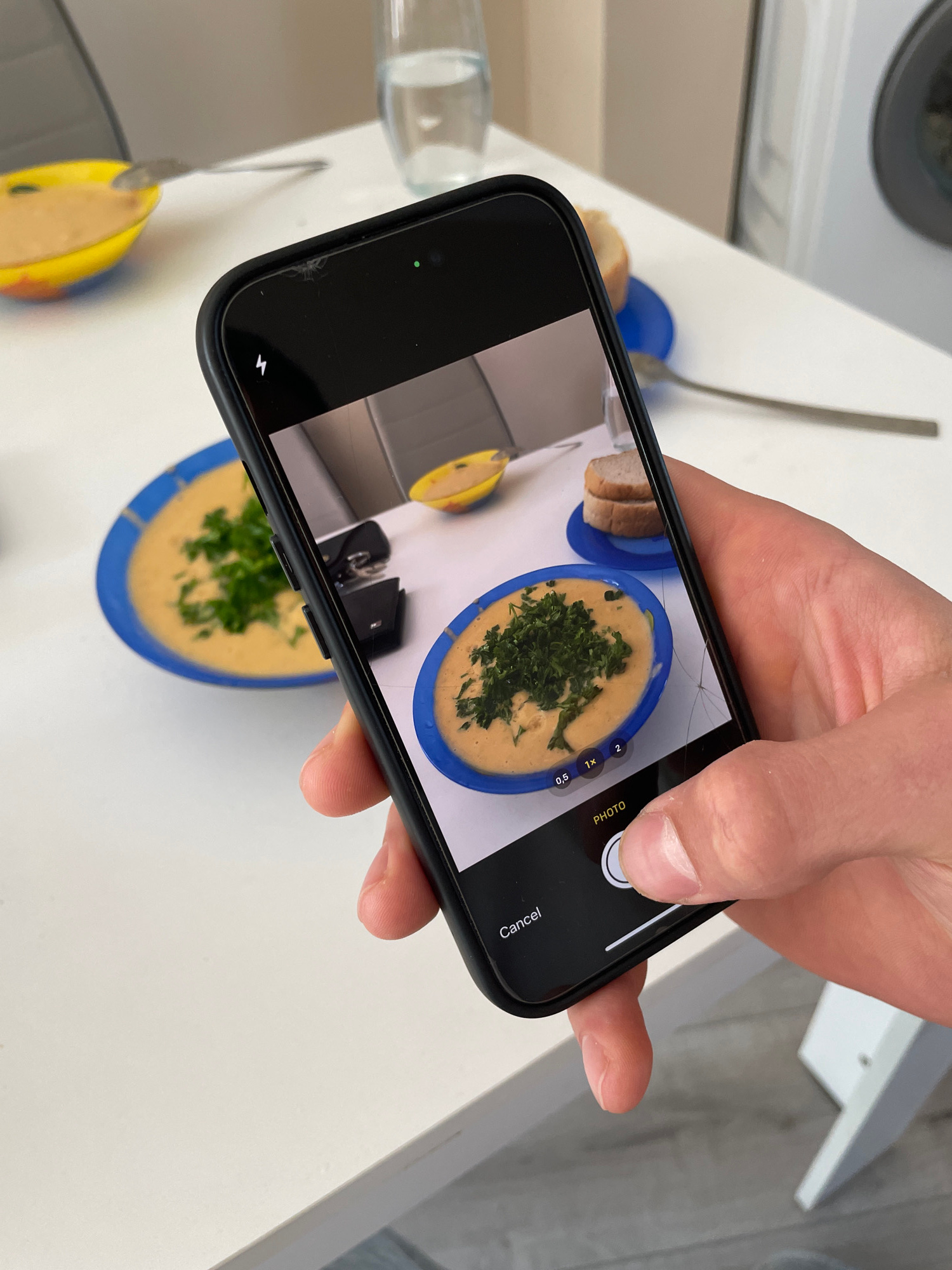 A person is holding a black smartphone to take a photo of a bowl of soup on a white table. The soup is yellow in color and garnished with green herbs, served in a blue-rimmed bowl. A few slices of bre…read more