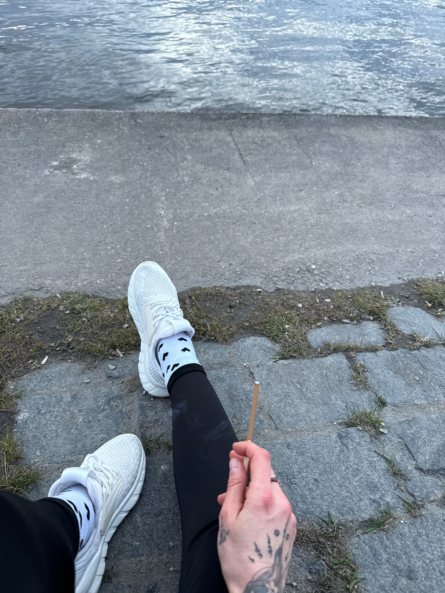 The image captures a high-angle view of a person's lower body, positioned outdoors beside a body of water. The subject is wearing black leggings and white athletic shoes, paired with white ankle socks…read more