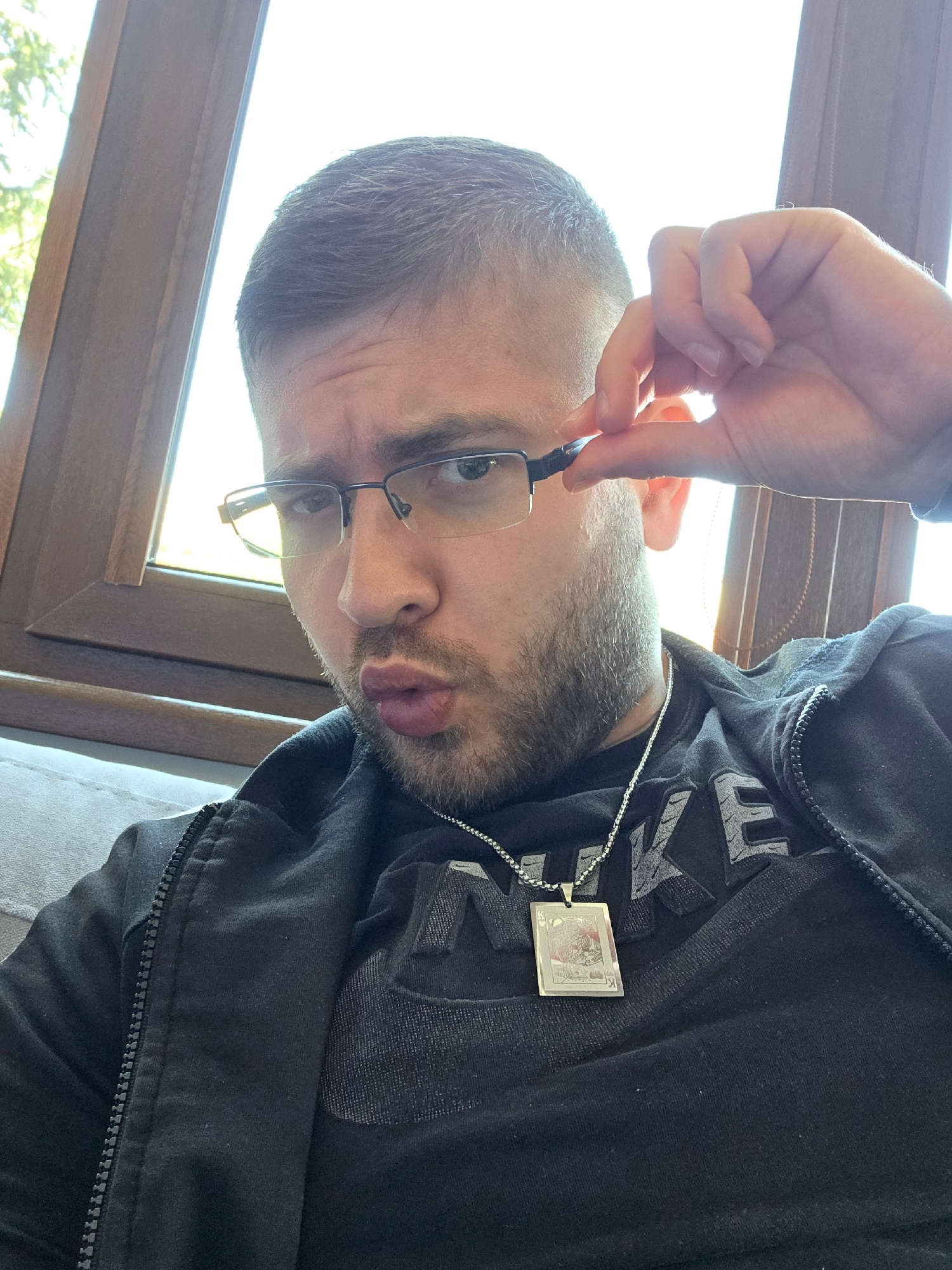 A man with short, light brown hair and a trimmed beard is looking at the camera. He's wearing glasses and a black zip-up hoodie over a black t-shirt with the word "NIKE" in gray letters. Around his ne…read more