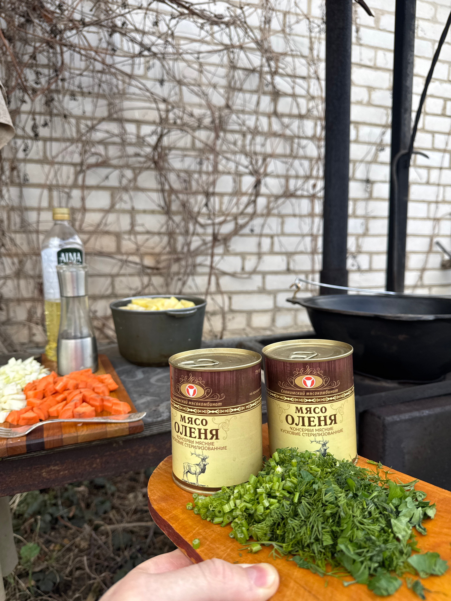 Here is a forensic description of the image: **Location:** Likely outdoors in Капцёўскі сельскі Савет, Belarus, evidenced by the product "Слонимский мясокомбинат," a Belarus-based meat-processing company. The backdrop appears to be a structure or fence with intertwining vines, suggesting a natural or garden setting. **Subjects & Objects:** * **Food preparation:** The scene centers on ingredients for cooking. There is a wooden cutting board holding chopped herbs (likely dill and parsley). Alongside are chopped carrots and cabbage. * **Canned goods:** Two cans of preserved meat labeled "МЯСО ОЛЕНЯ" (meaning "Deer/Venison Meat") are visible. The label also states that they are "КУСКОВЫЕ СТЕРИЛИЗОВАННЫЕ," meaning "chunk-style sterilized/preserved." * **Other ingredients and equipment:** There is a bottle of oil and a pot filled with potatoes. A cooking pot is visible above the cans. * **Human presence:** Part of a hand is visible on the right side of the frame. **Scene Description:** The scene shows ingredients prepped and ready for cooking. The presence of canned venison meat suggests a rustic or traditional dish is being prepared. The background provides a natural outdoor setting. | Open Wire