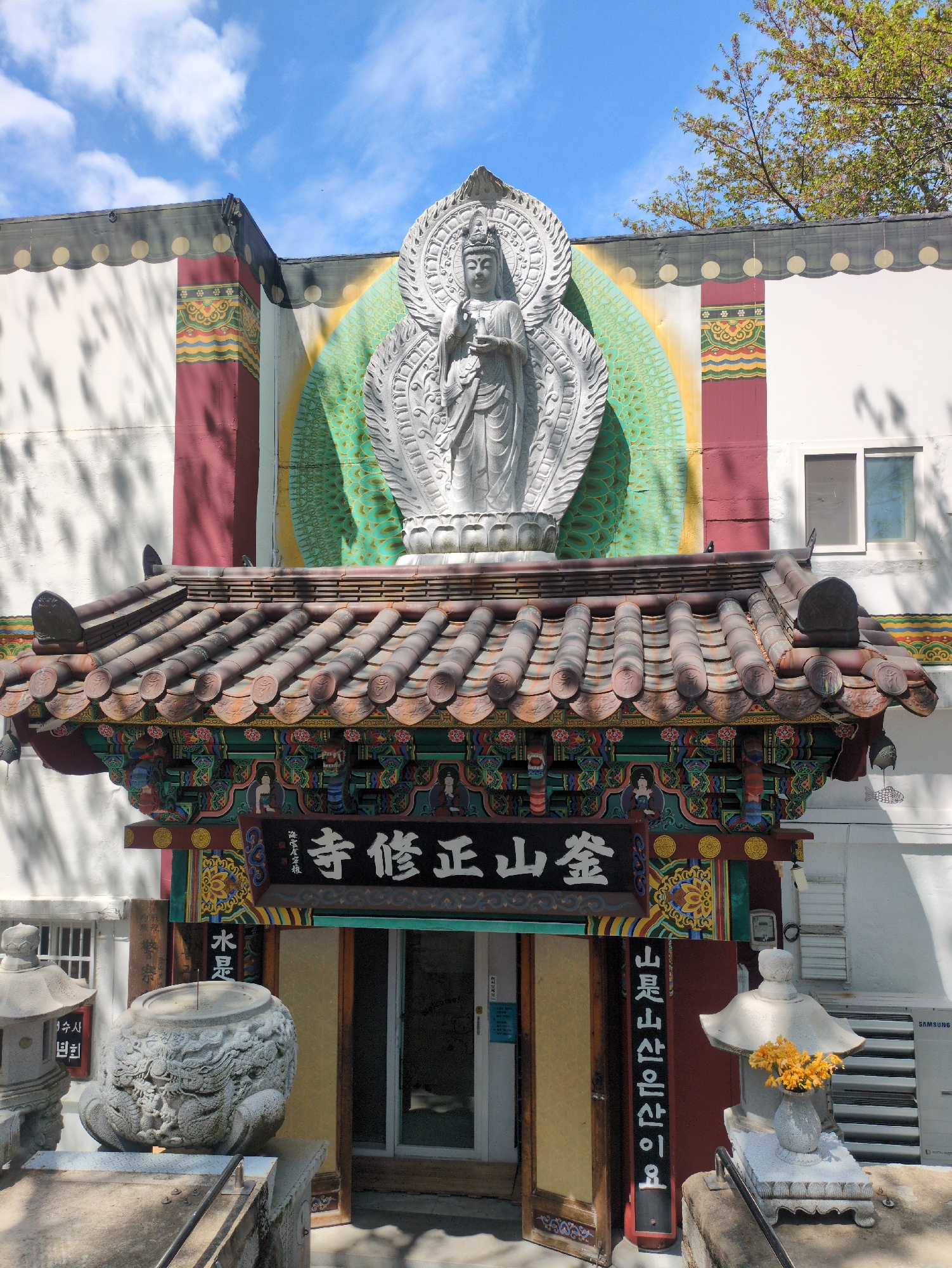 The image depicts the entrance to a Buddhist temple, likely in the city of Busan, South Korea, based on architectural styles and signage. The temple entrance features a large relief sculpture of a Bud…read more