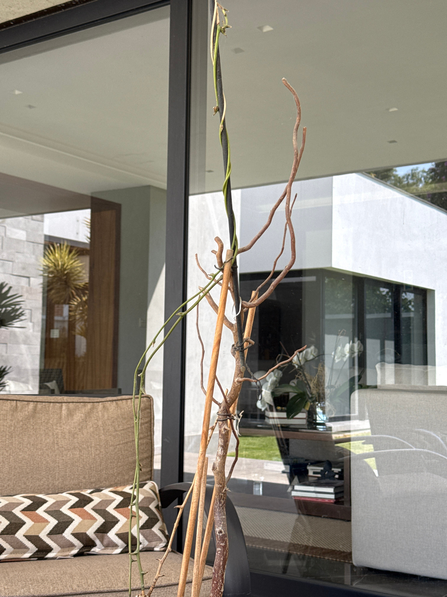 A view through a window shows a tan couch with a chevron patterned pillow. There are decorative branches between the window and the couch. Reflected in the window are parts of a house with landscaping…read more