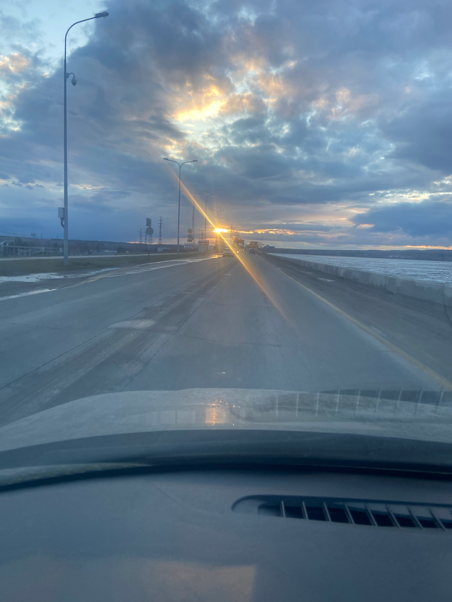 The image, taken from inside a vehicle looking out, captures a wide road or causeway running alongside a large body of water under a dramatic sky. The perspective is slightly rotated, with the road ap…read more