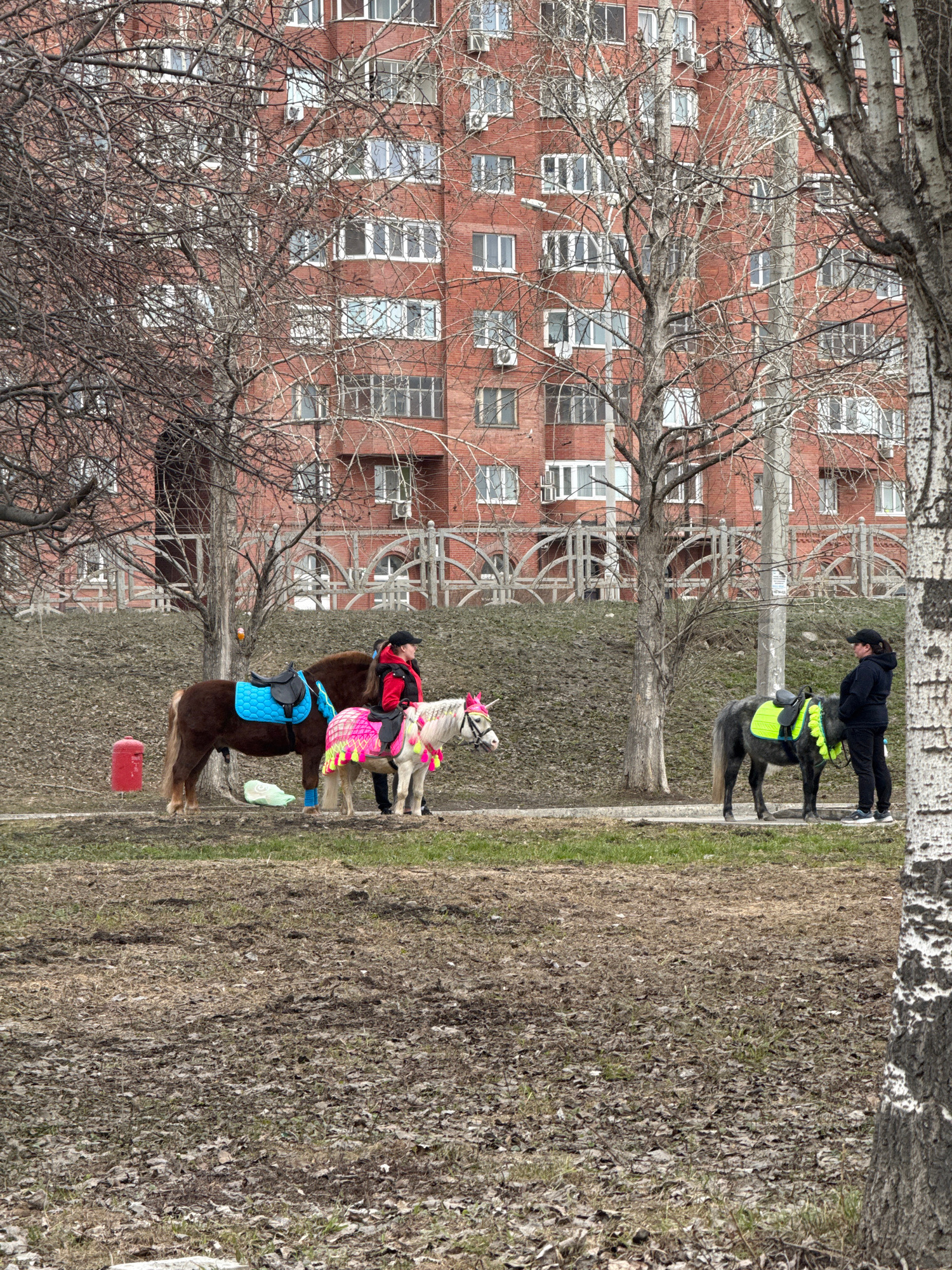 An outdoor scene in an urban green space within Yekaterinburg, Russia, depicts three ponies with two adult female handlers against a backdrop of residential buildings. The environment is characterized…read more