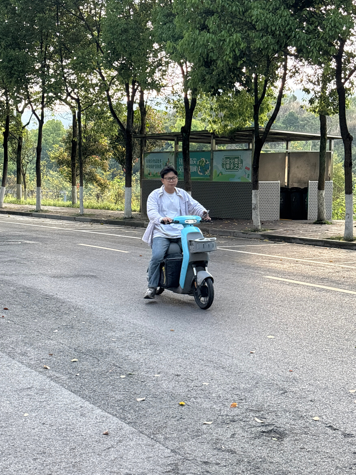 The image shows a person riding a light blue and gray electric scooter on an asphalt road. To the left, there is a park area with trees and a fence. A sign near the fence has Chinese characters on it,…read more