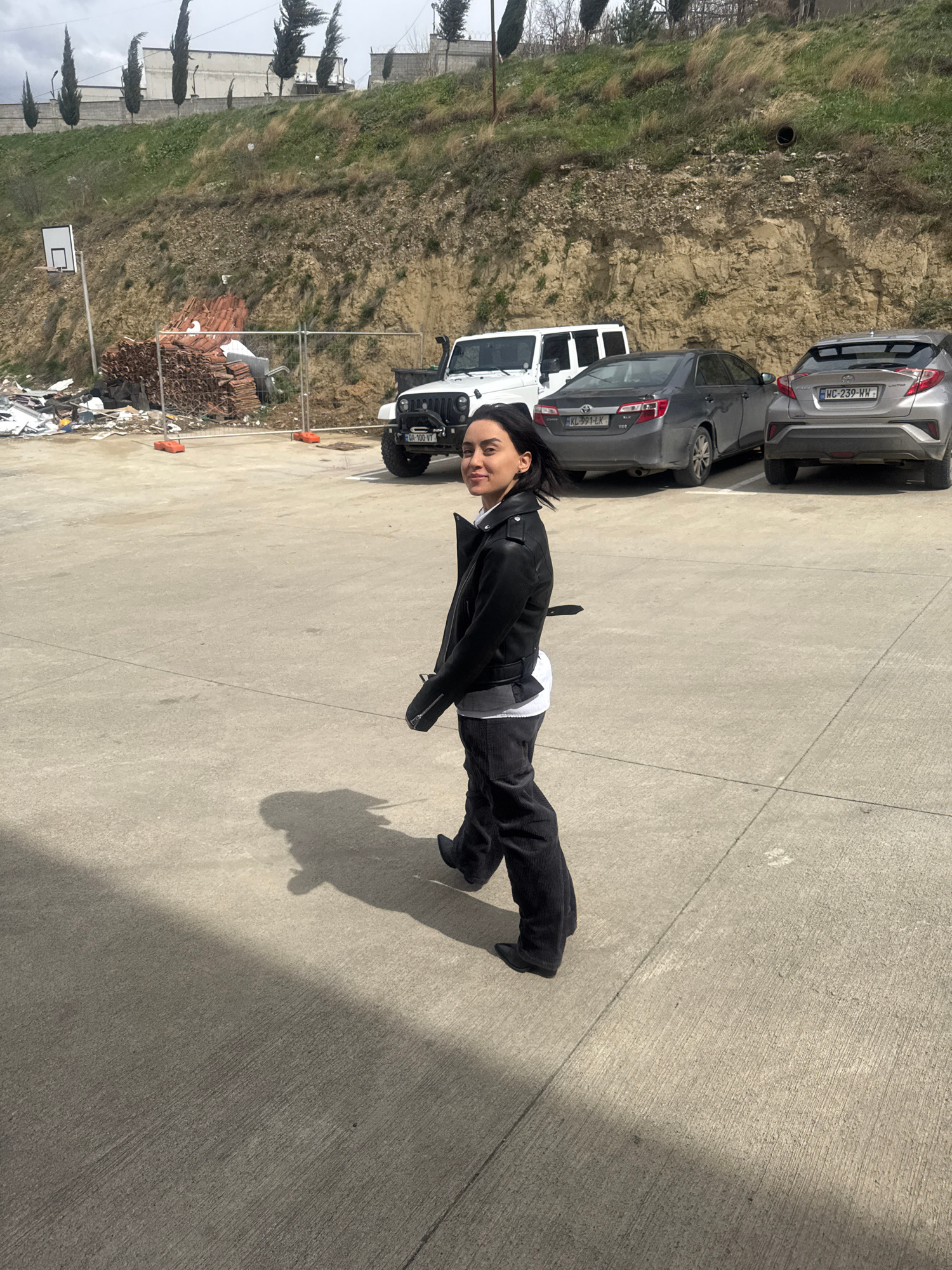 The image shows a person standing on a paved surface, possibly a parking lot or public square. The person is wearing dark clothing, including a jacket and pants, with a light-colored shirt visible und…read more