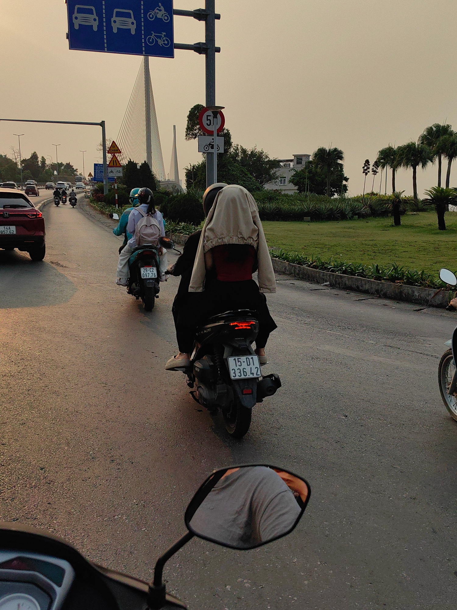 The image depicts a street scene in Hong Gai Ward, Vietnam, during daylight. Several people are riding motorbikes on a paved road. A car is visible in the background. Traffic signs indicate lanes forβ¦read more