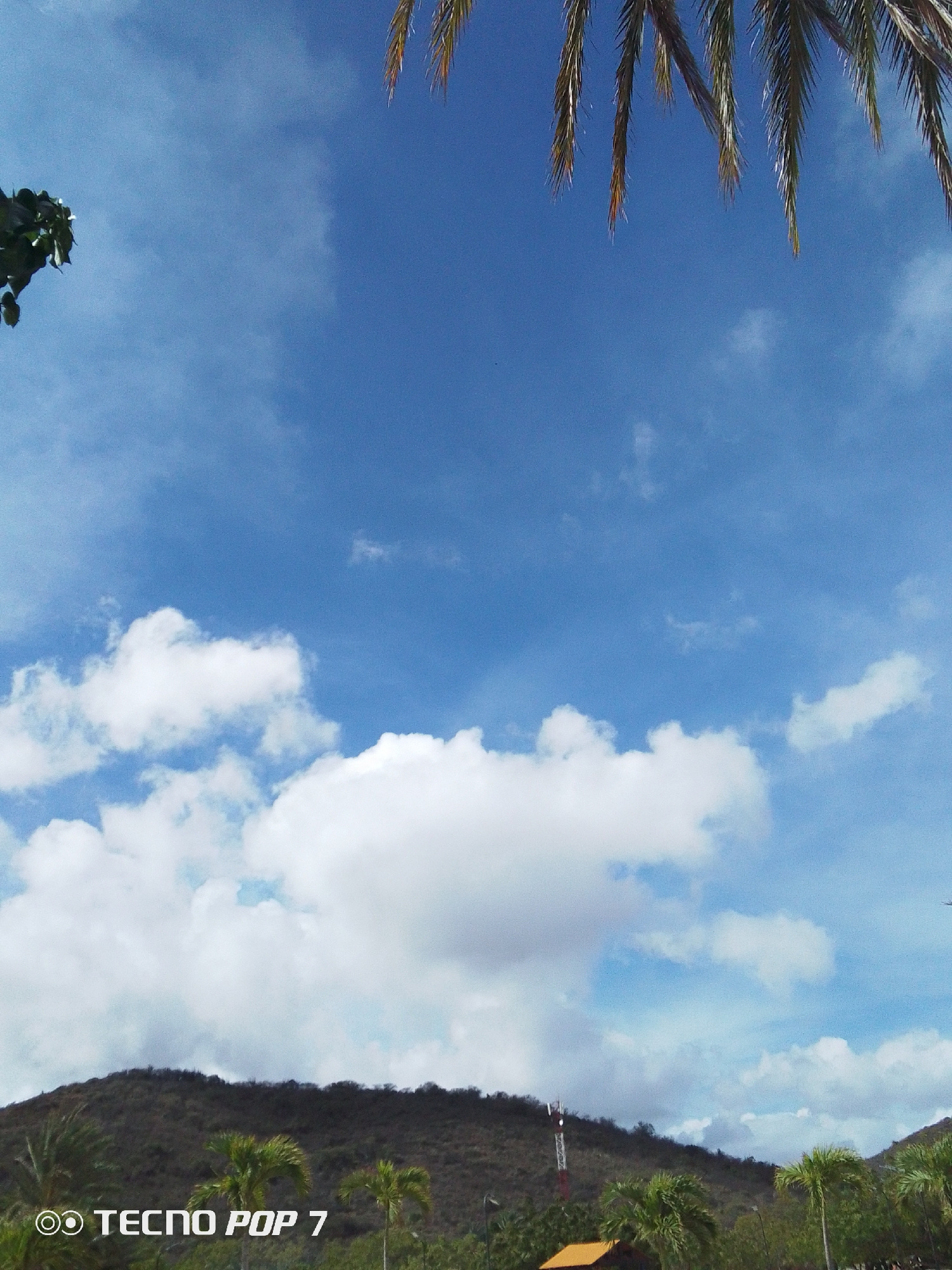 The image shows a daytime scene in Pedro González, Venezuela. The sky is predominantly blue with scattered white clouds. Palm tree fronds are visible at the top of the frame. In the foreground, there'…read more