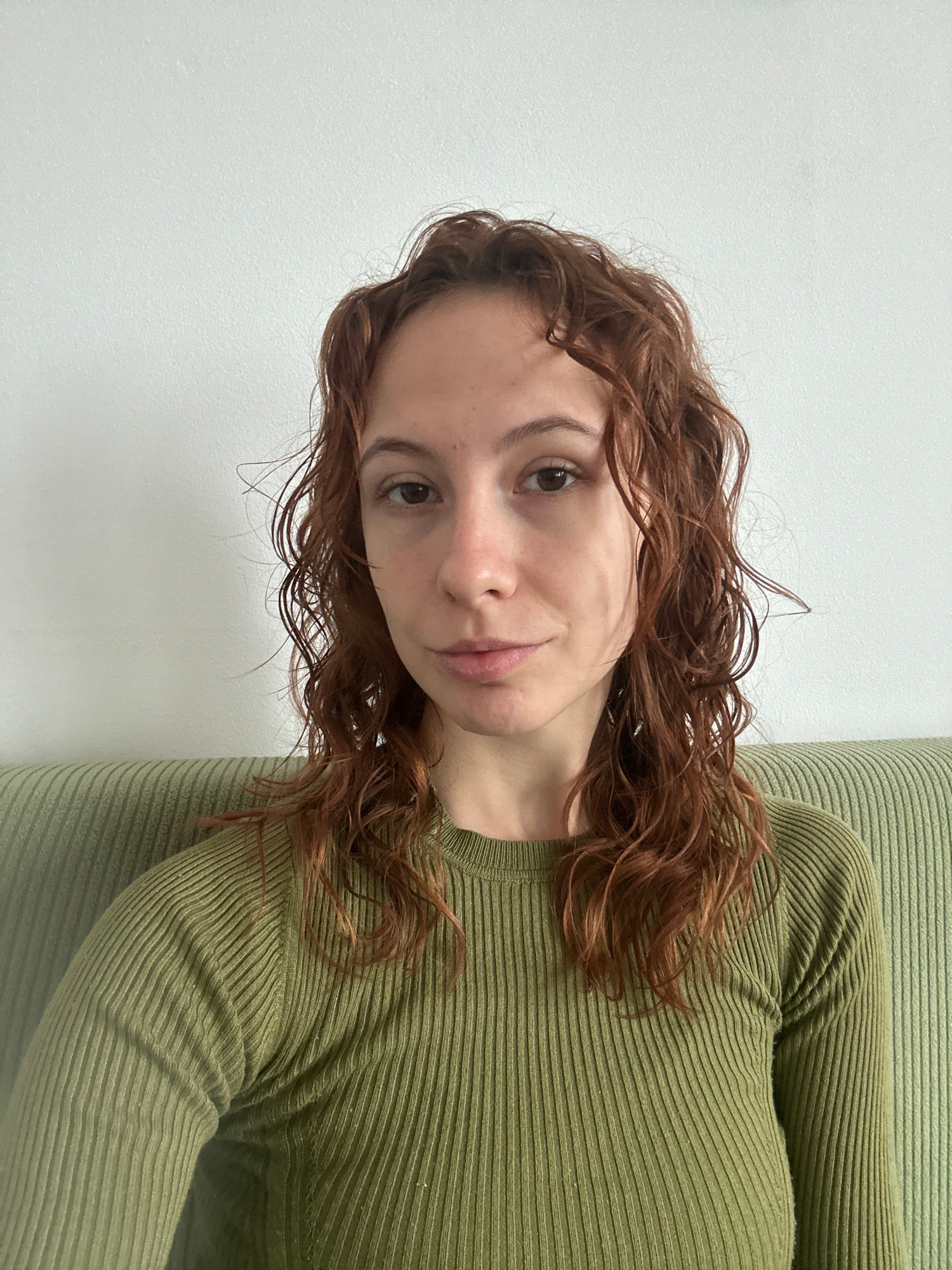 A young woman with light skin and reddish-brown curly hair is centered in the image. She is wearing a ribbed, olive-green long-sleeved top. Her head is tilted to the right, and she is looking directly at the camera. The background is divided between a light-colored wall on the left and a textured, presumably upholstered, surface in a similar shade of green to her shirt on the right. No specific elements indicate that this photo was taken in Novi Sad, Serbia, or provide any other geographical information. | Open Wire