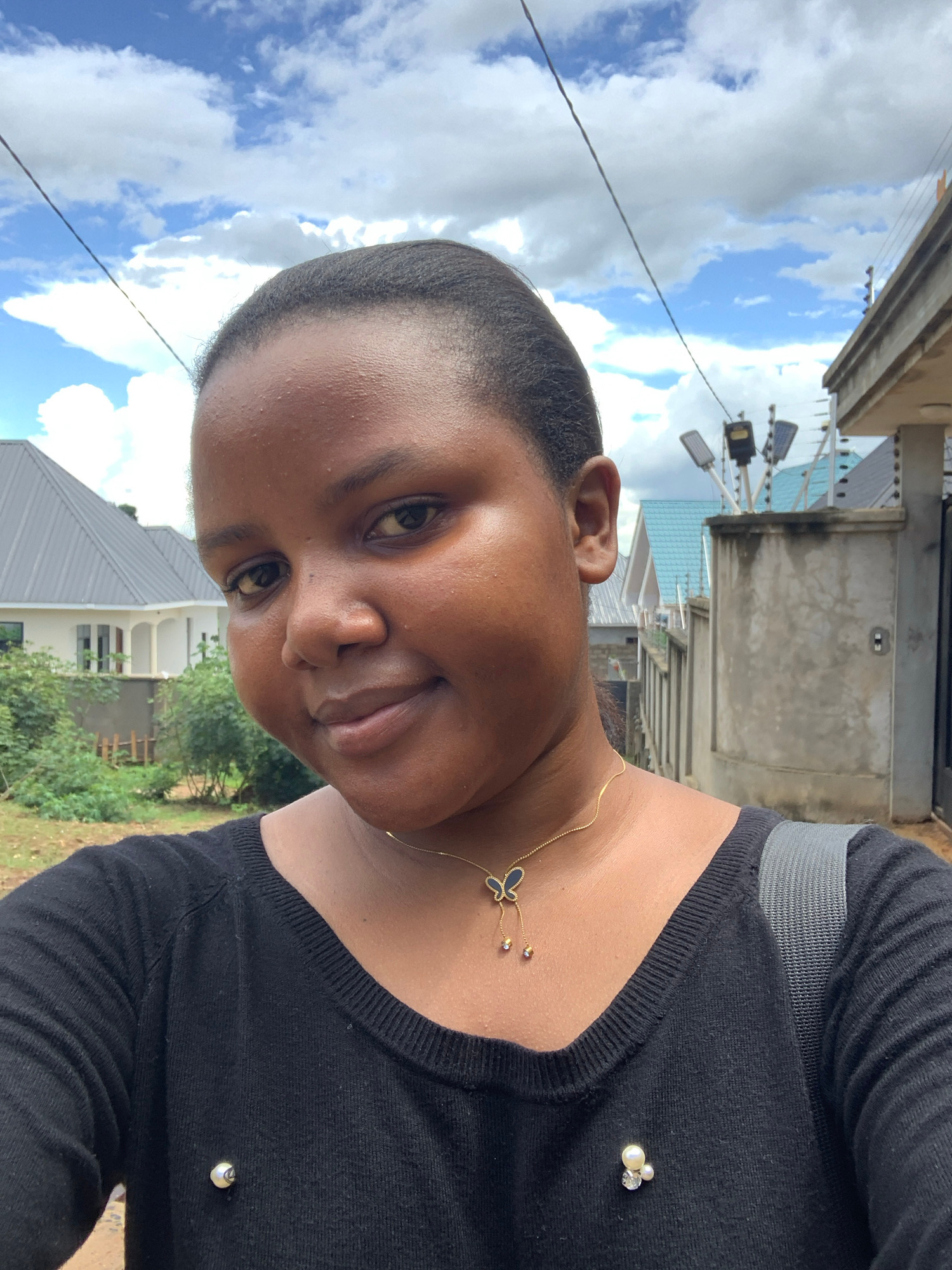 The image displays a close-up, selfie-style portrait of a female individual with a dark complexion, centered, looking directly at the camera with a slight smile. She is wearing a black long-sleeved to…read more