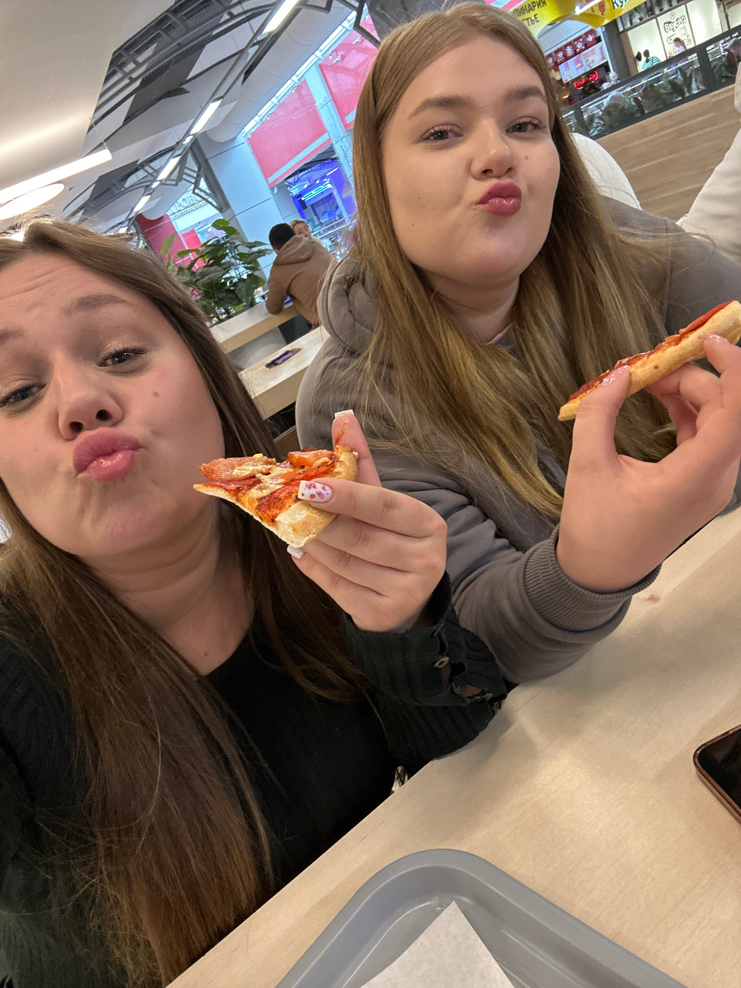 Two young women are posing for a selfie while holding slices of pizza. The woman on top is wearing a gray sweatshirt, and the woman on the bottom is wearing a black top. They both have blonde or brownβ¦read more