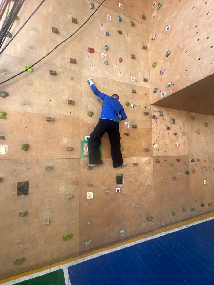 An individual is shown from behind, actively engaged in rock climbing on an indoor wall within a facility in Sarapul, Russia. The climber wears a blue long-sleeved shirt, black trousers, and light-col…read more