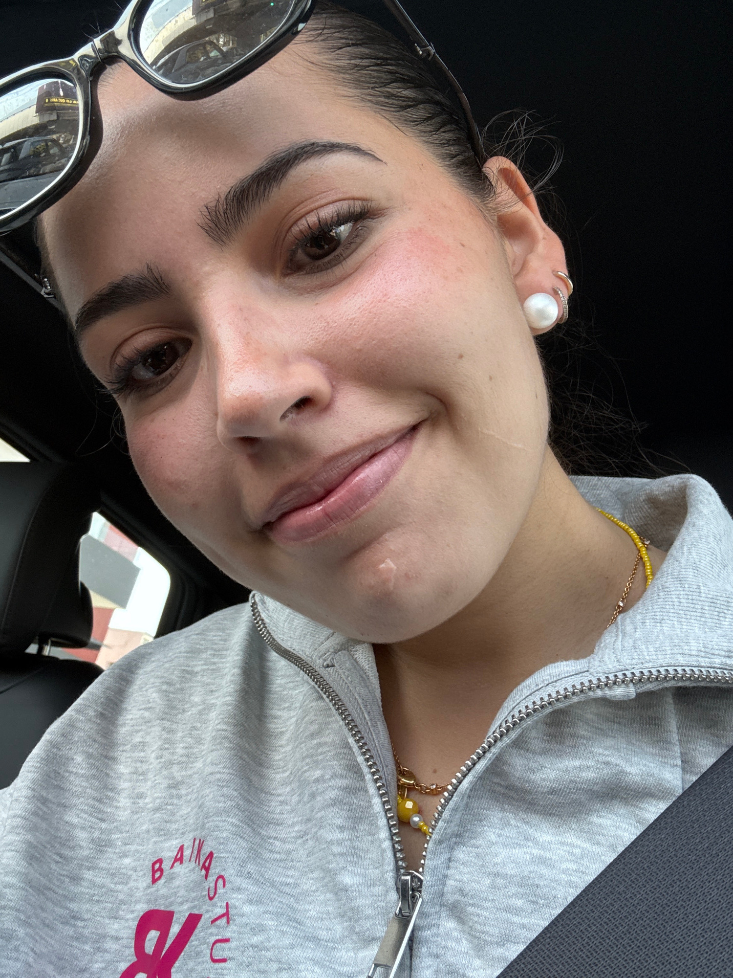 The image shows a woman indoors, possibly in a car, wearing glasses, a grey hooded jacket, and jewelry (earring and necklace). The text on the jacket reads "BANASTUA". The location is possibly Puebla,…read more