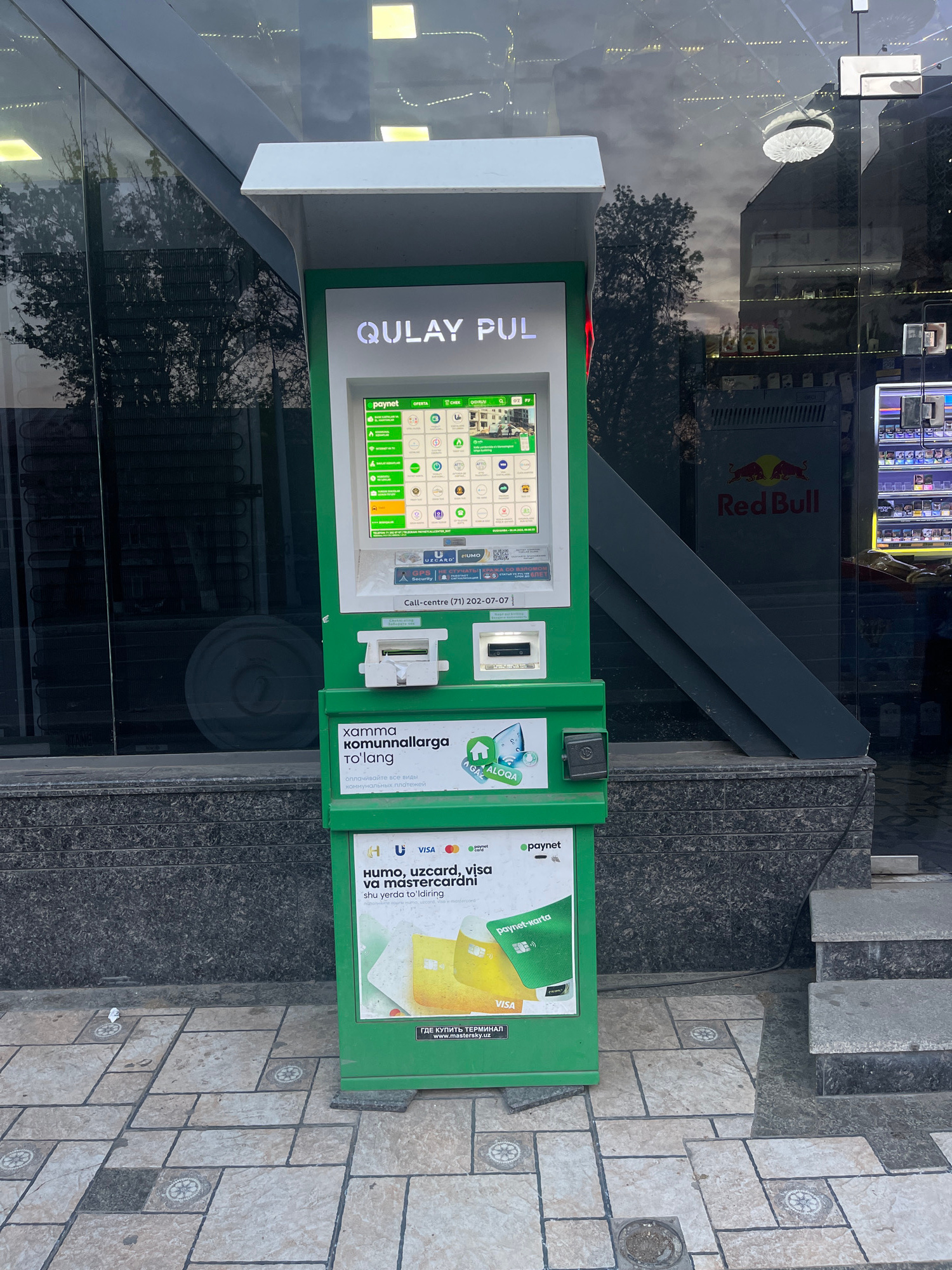 The image shows a green "Qulay Pul" payment kiosk, a common sight in Tashkent, Uzbekistan. The kiosk features a touchscreen interface with icons representing various payment options. Adjacent to the s…read more