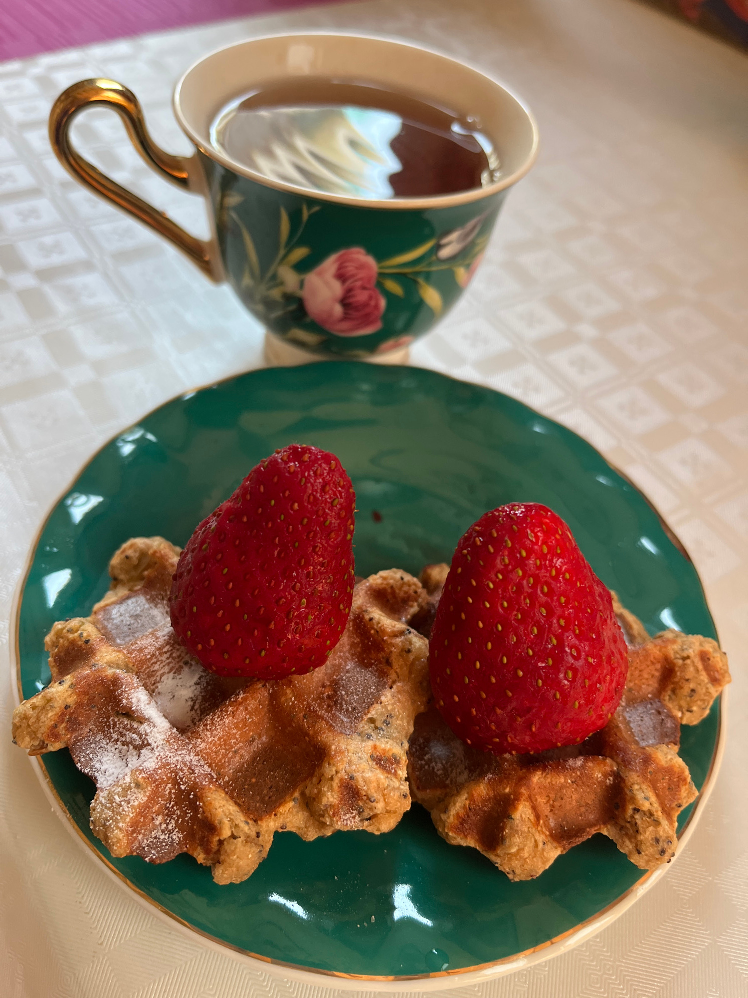 A high-angle, close-up shot depicts a breakfast scene on a white tablecloth, likely indoors. A teacup, patterned with flowers and filled with tea, stands to the left of a round, green plate. The plate…read more