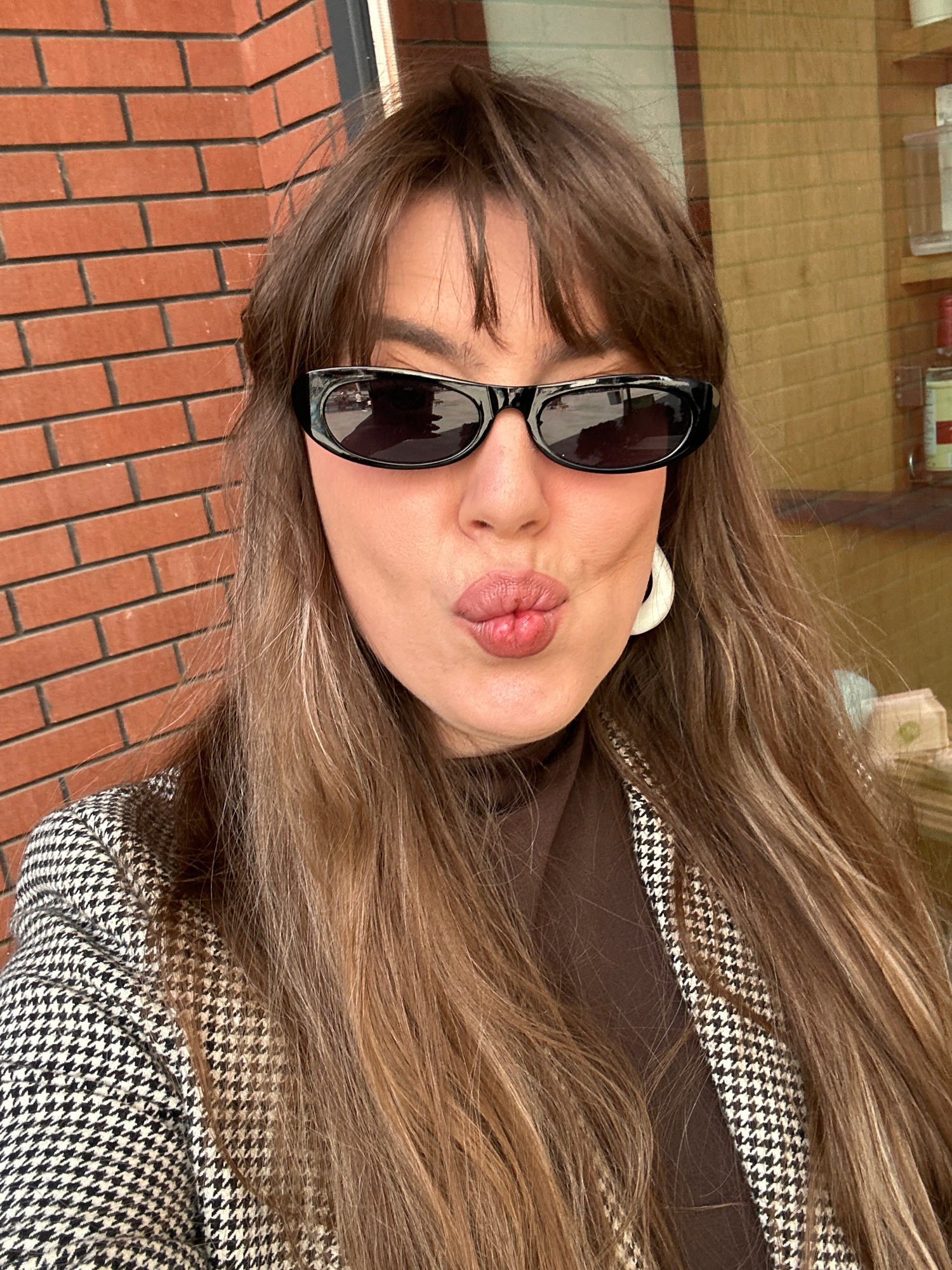 A close-up, rotated portrait captures a young woman against an urban backdrop, likely in Tbilisi, Georgia. Her long, wavy brown hair frames her face, flowing over her shoulders and jacket. She wears l…read more