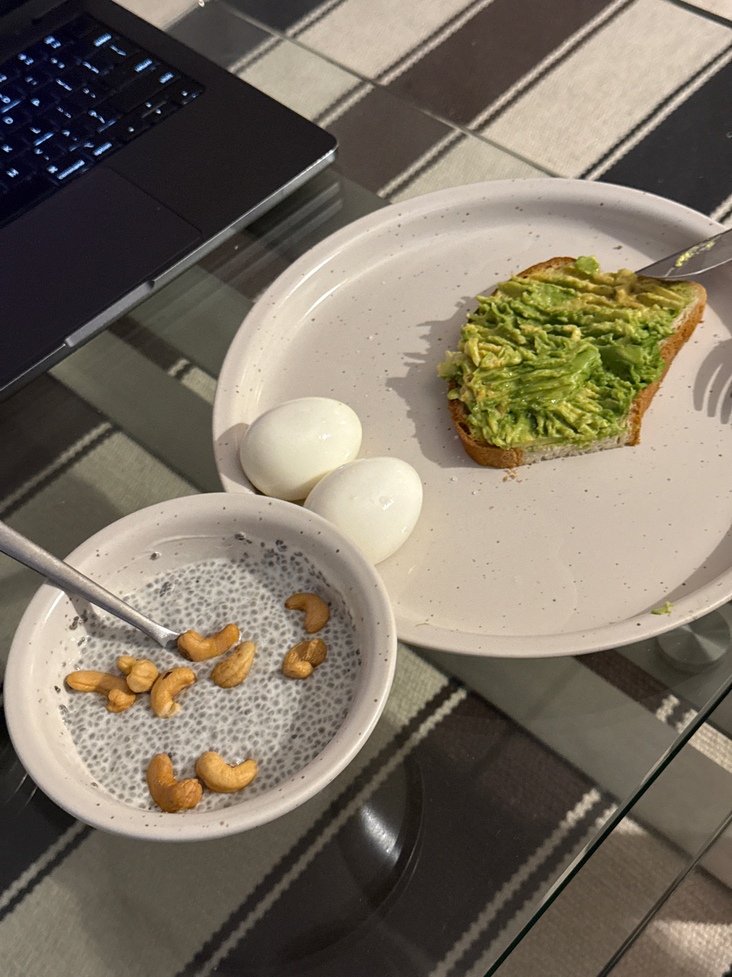 The image shows a meal consisting of avocado toast, two hard-boiled eggs, and a bowl of chia seed pudding topped with cashews, arranged on a speckled white plate and a smaller bowl. A fork rests on th…read more