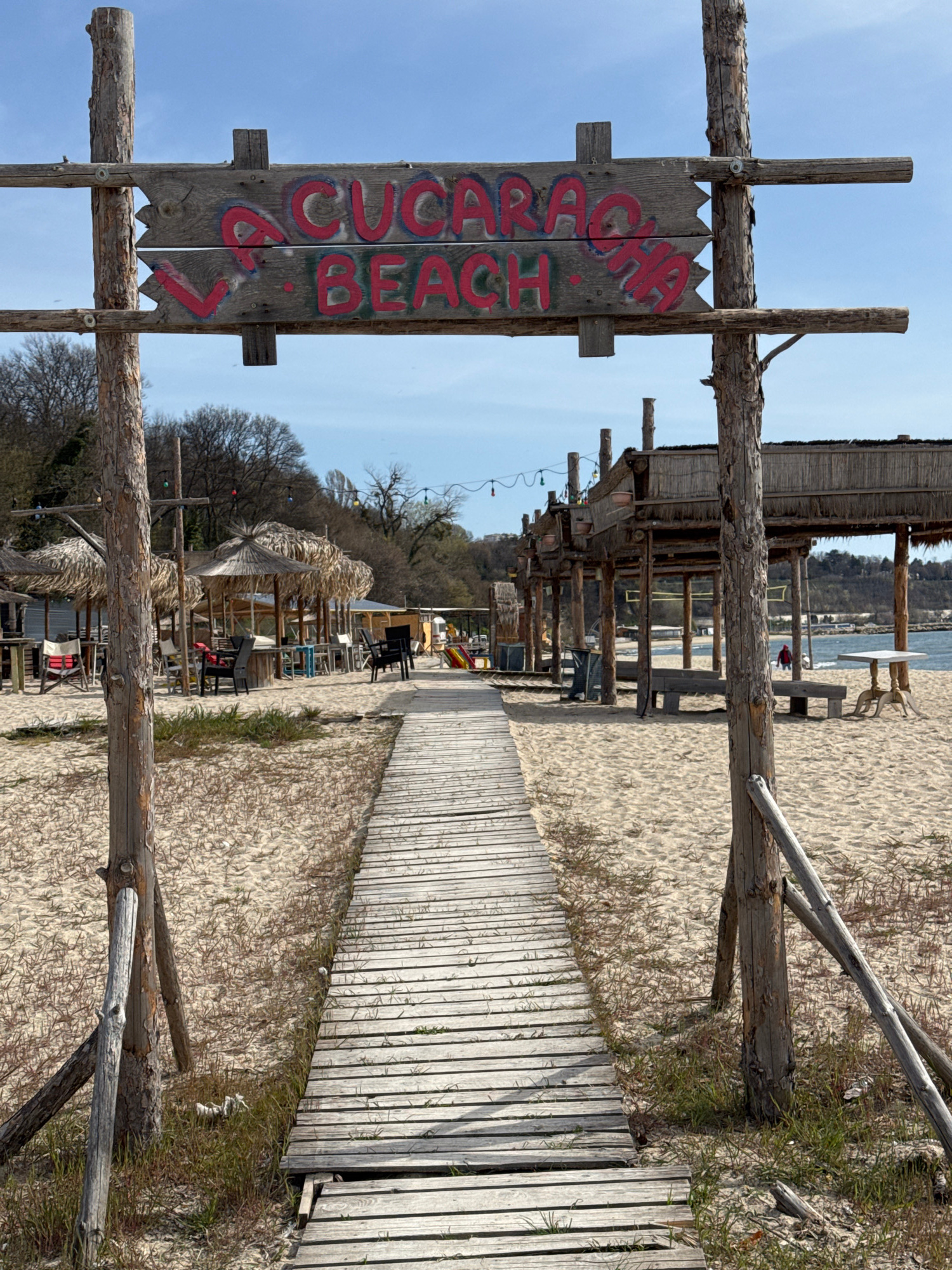 This image captures a beach scene in Varna, Bulgaria. A weathered wooden sign reading "V. Cucaracha Beach" stands prominently in the foreground. Behind the sign, a wooden boardwalk stretches towards t…read more