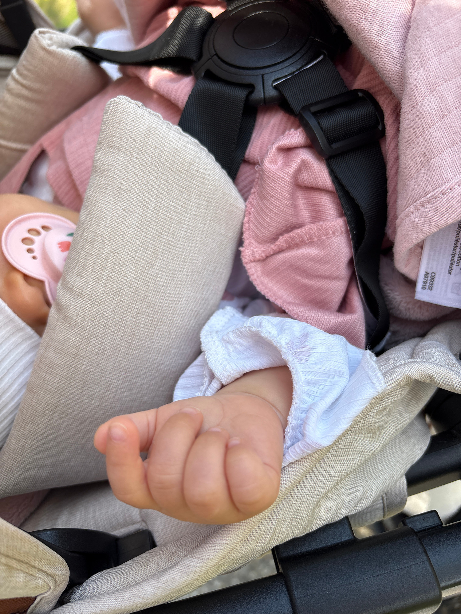 This close-up photograph shows a baby secured in a stroller. The baby is wearing a white shirt with ruffled cuffs and a pink pacifier is visible near their mouth. A black stroller harness is fastenedβ¦read more