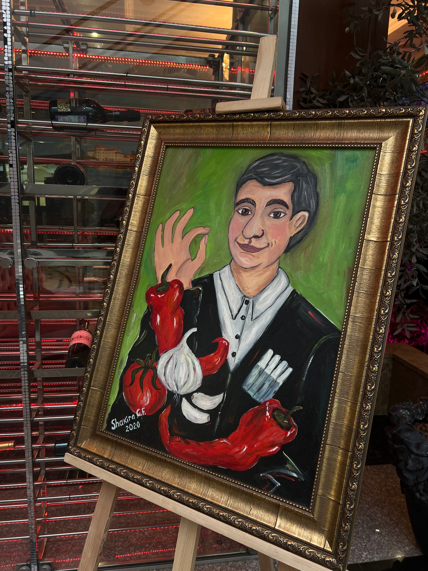 The image shows a framed painting of a man in a suit accompanied by vegetables, peppers, and garlic. The man is light-skinned with dark hair and wearing a white collared shirt with a black jacket. A d…read more