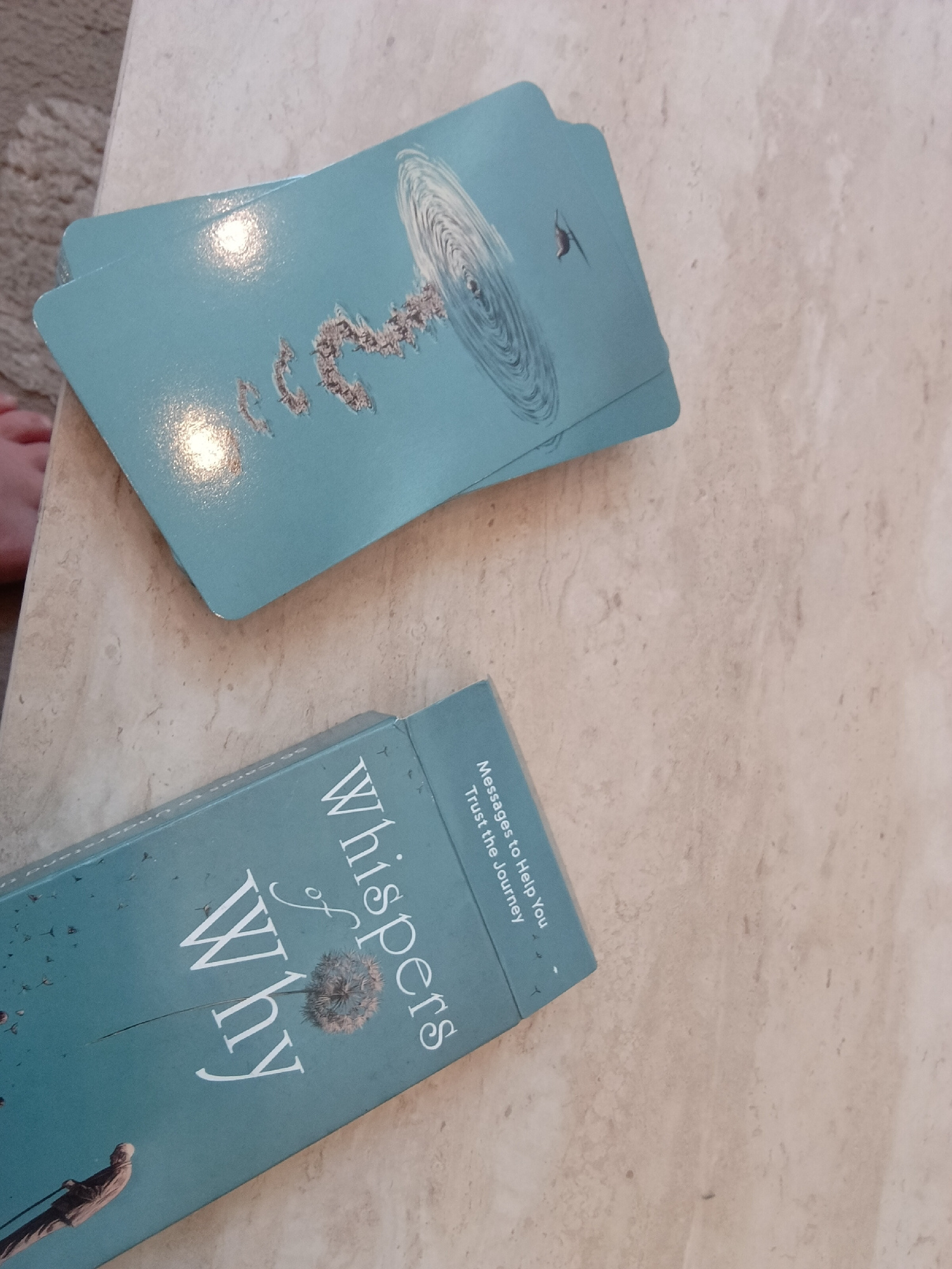 The image shows a deck of "Whispers of Why" cards and their box on a marble-patterned surface. The cards are turquoise with an image of concentric circles resembling water ripples. A small bird is als…read more