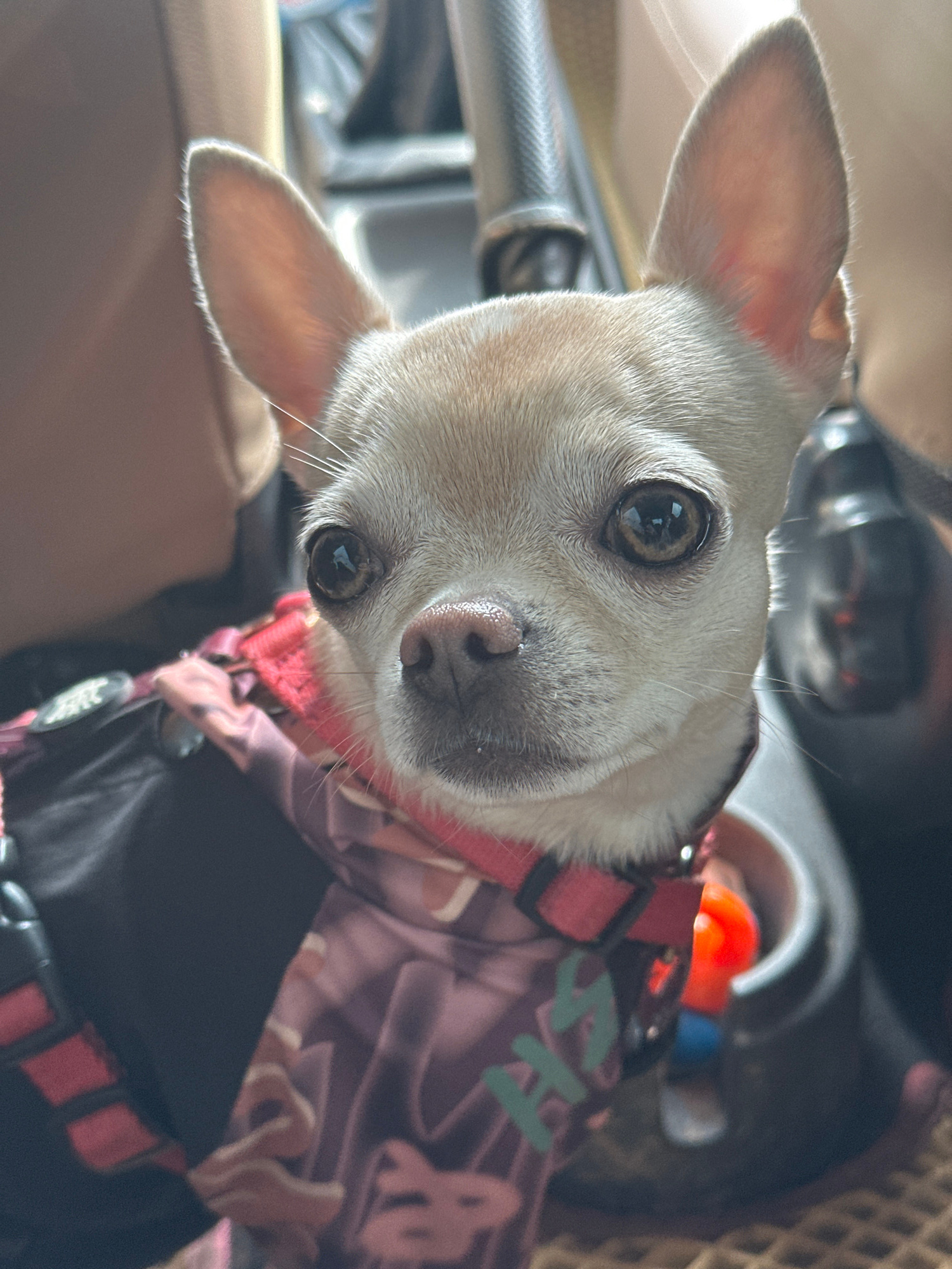A tan Chihuahua wearing a red harness and a maroon patterned coat is tilted toward the camera. The dog's head is angled, with its large ears and brown eyes prominent. A vehicle's dashboard and steerin…read more