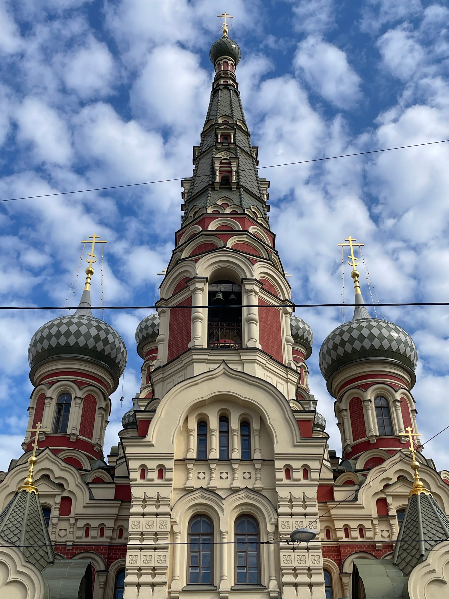 The image displays a majestic and ornate Russian Orthodox church building, captured from a low-angle perspective against a vibrant blue sky dotted with fluffy white clouds. The primary subject is the…read more