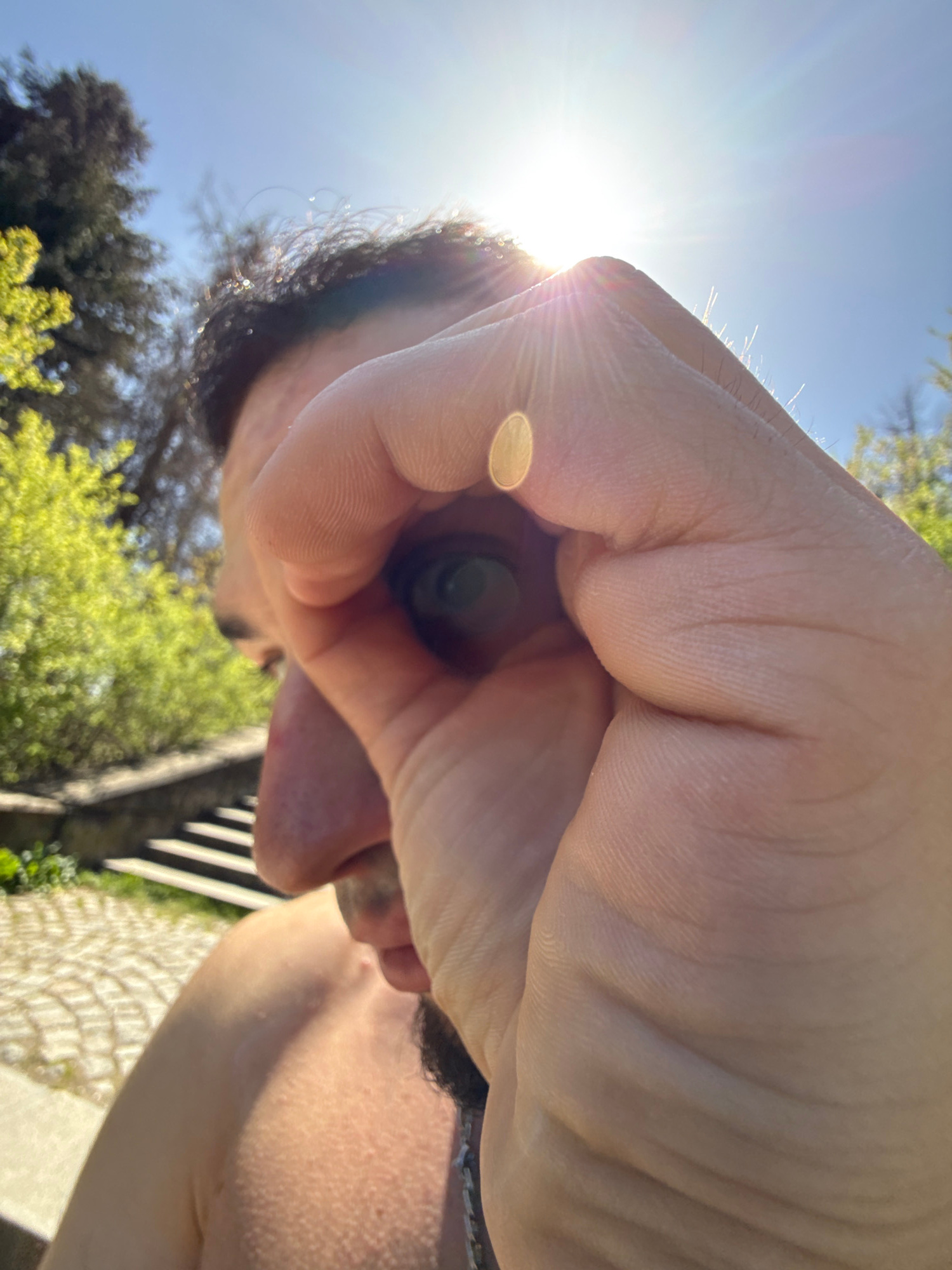 The image, rotated 90 degrees counter-clockwise, presents a unique perspective of a person's hand and head against a bright outdoor backdrop in Shumen, Bulgaria. The main subject is a person's light-s…read more