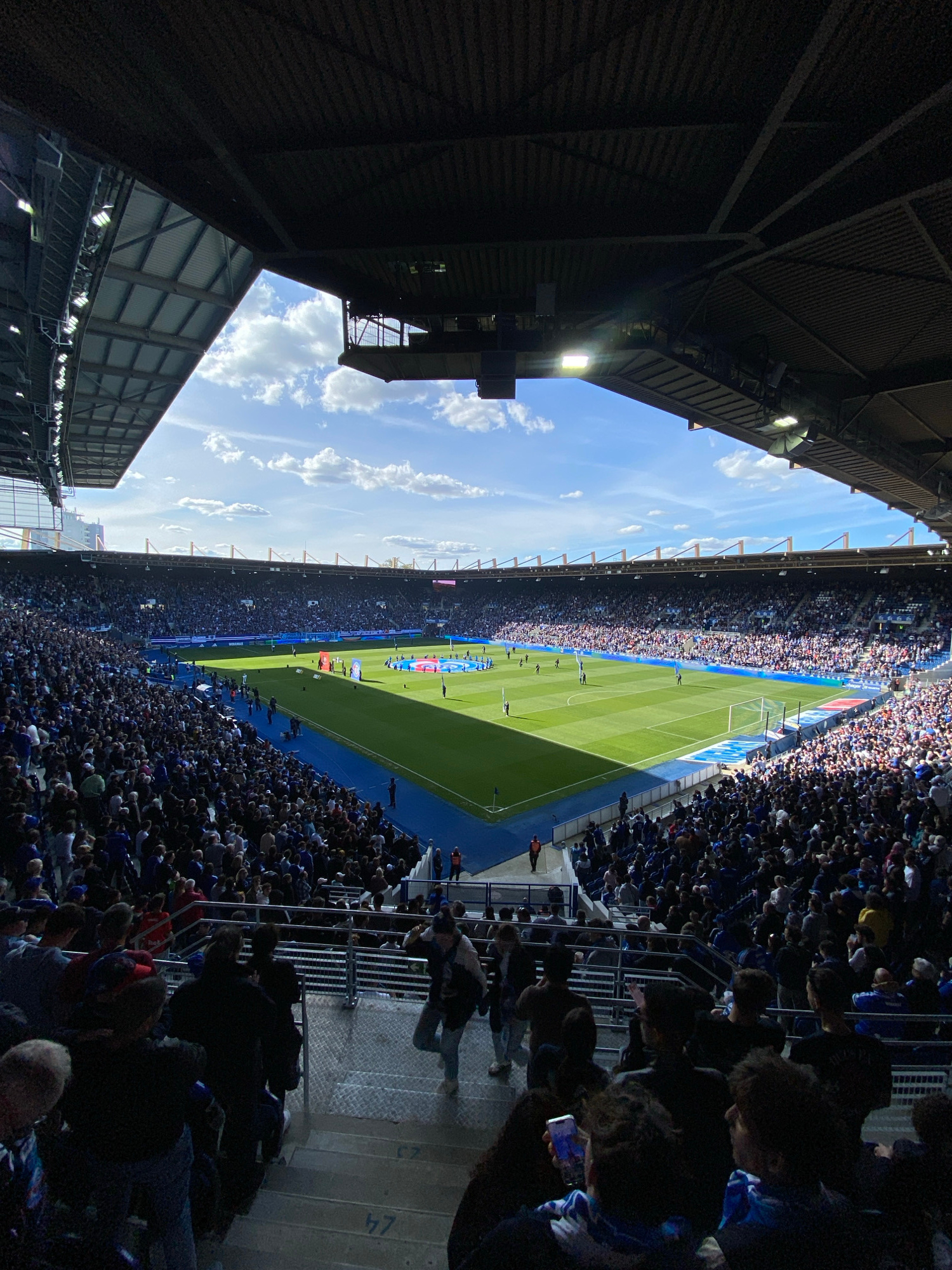 The image shows a soccer game in progress at Stade de la Meinau in Strasbourg, France. The stadium is filled with spectators, primarily wearing blue and white, indicating support for the home team, Ra…read more