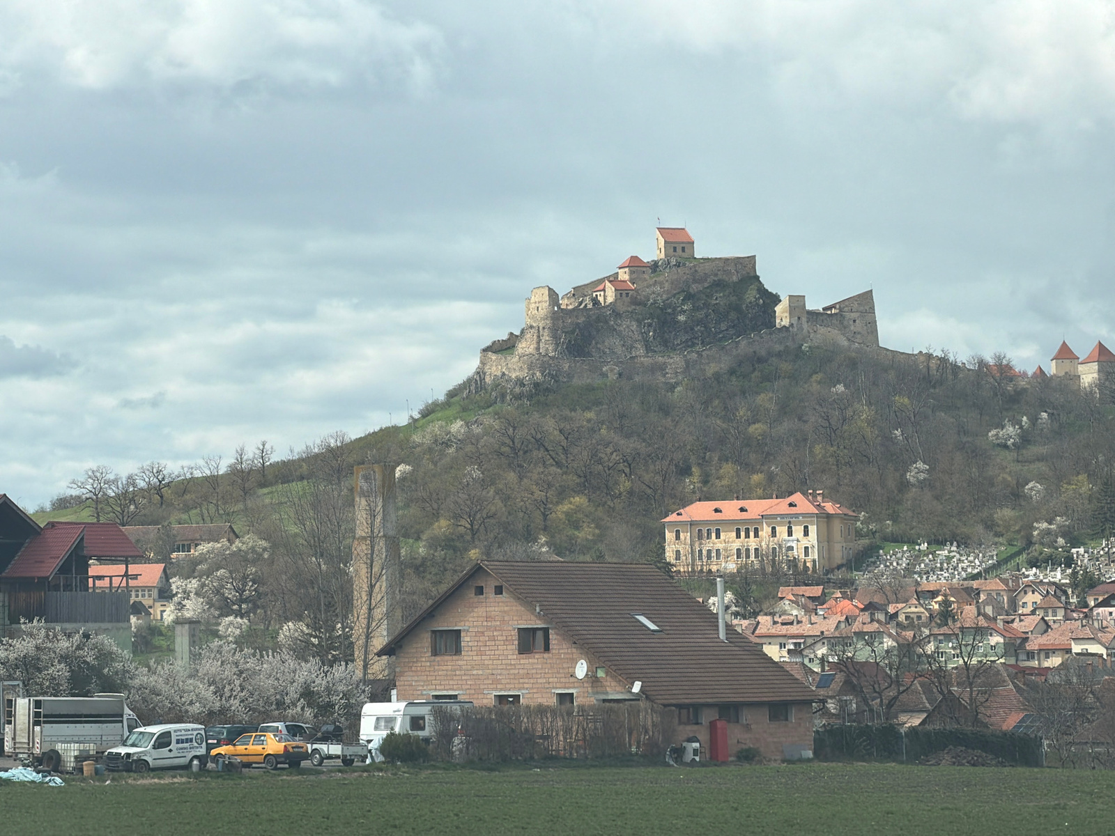 The image depicts a landscape in Rupea, Romania, with Rupea Fortress prominently situated atop a hill in the background. The sky is overcast with grey clouds. The fortress appears to be a historical s…read more