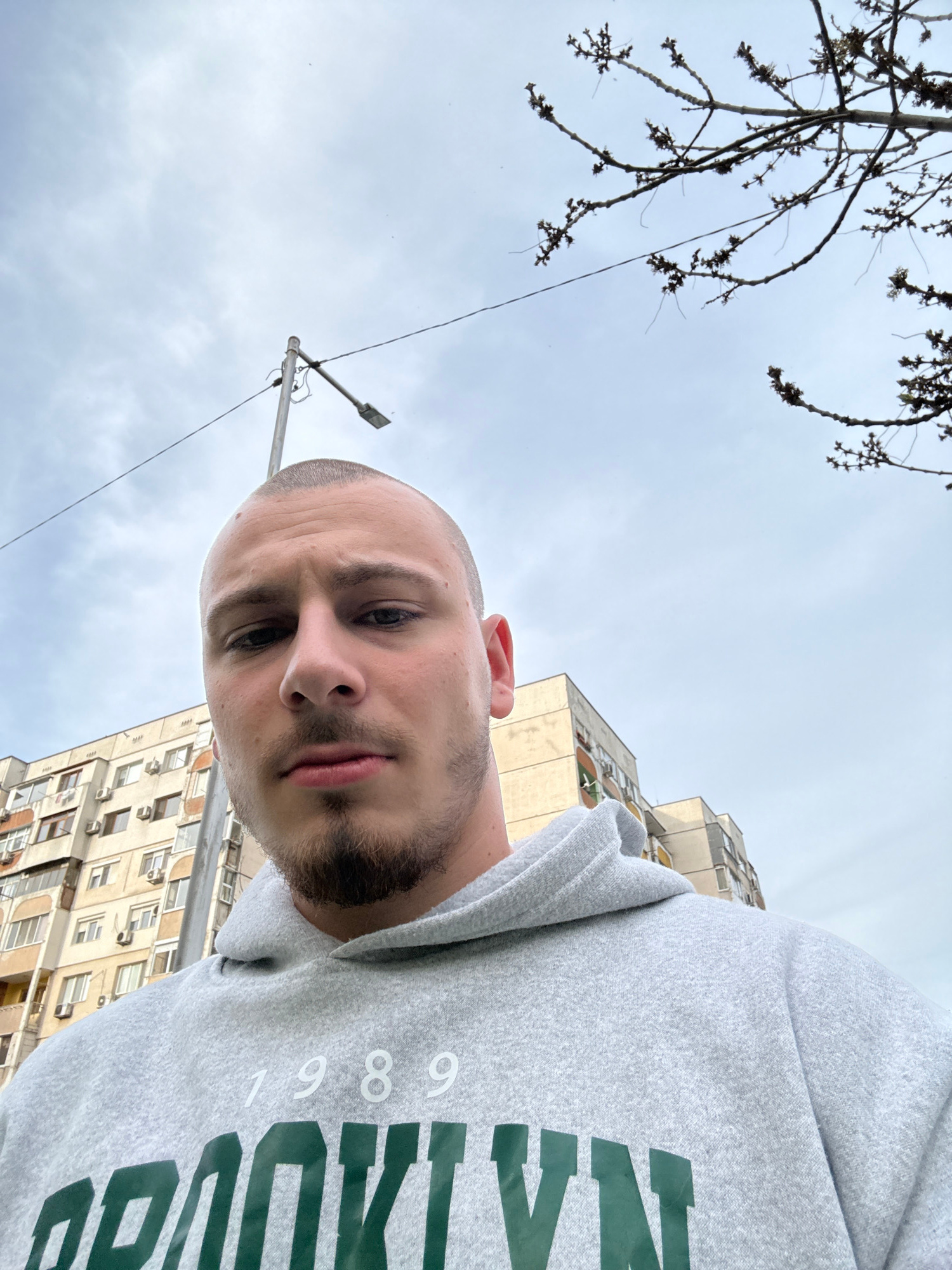 The image is a low-angle, tilted selfie of a young man in an urban setting in Stara Zagora, Bulgaria, taken on an overcast day. The subject is a man with a shaved head and a short beard, appearing toβ¦read more