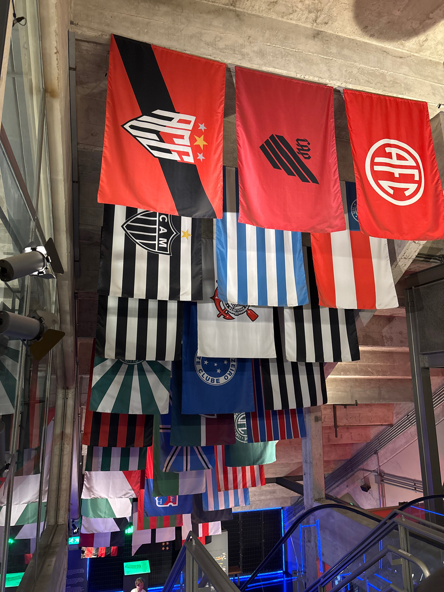 The image shows a display of multiple sports flags hanging from a ceiling or wall, likely in an interior space. The flags are of various teams and patterns, including red, white, blue, black, and gree…read more