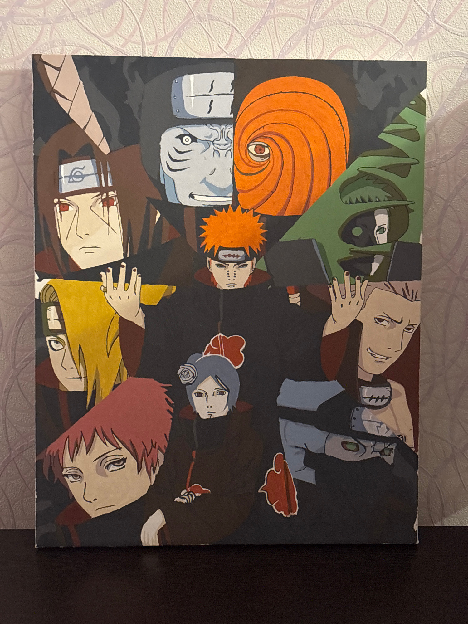 The image shows a fan-made painting of characters from the anime Naruto. The characters, members of the Akatsuki organization, are arranged in a collage-like composition. They include (from left to ri…read more