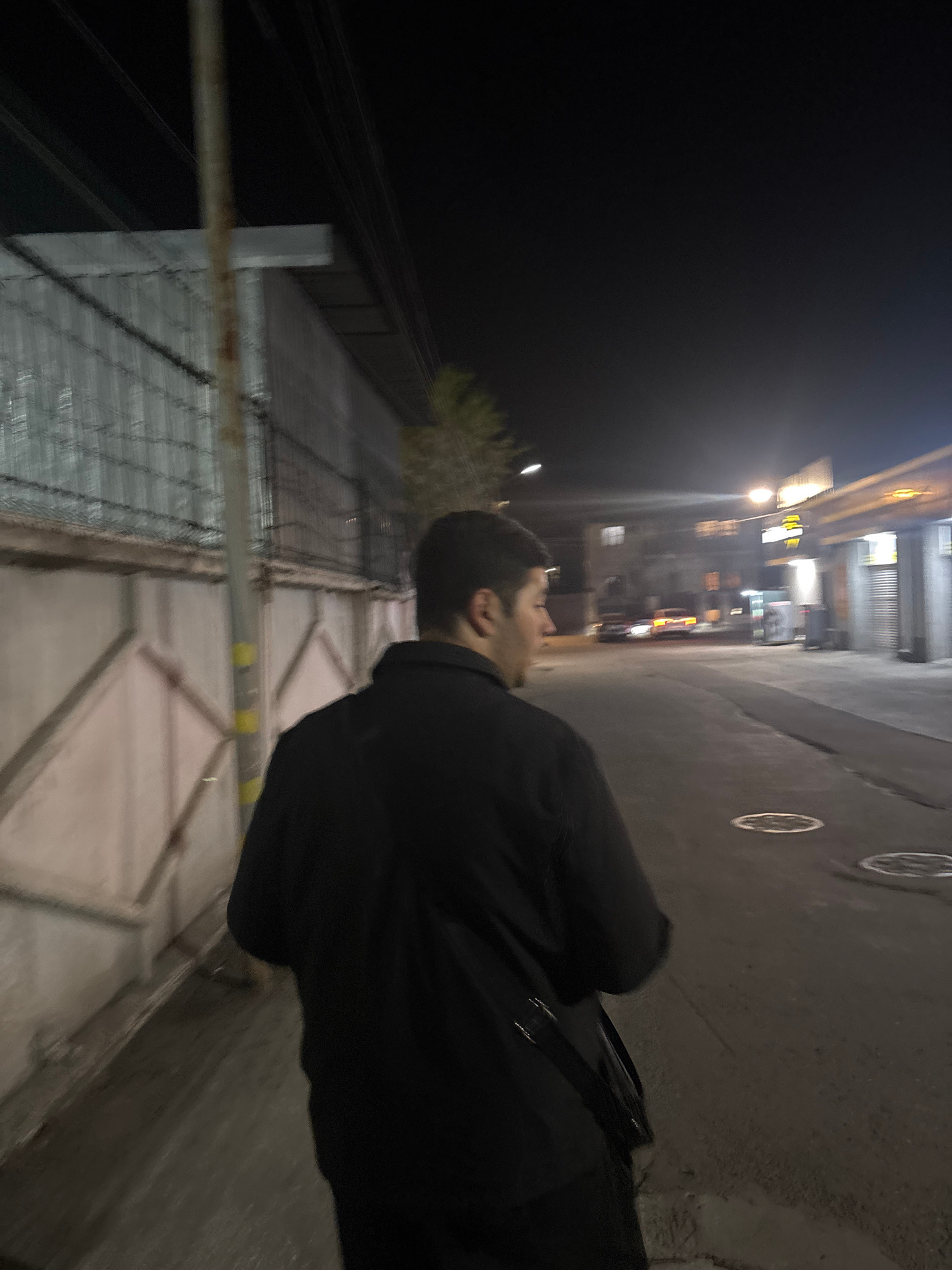 A person wearing a black shirt stands on a Yerevan, Armenia, city street next to a metal fence. Behind the fence is a tree and dark sky. Street lights shine further down the street. The person is faci…read more