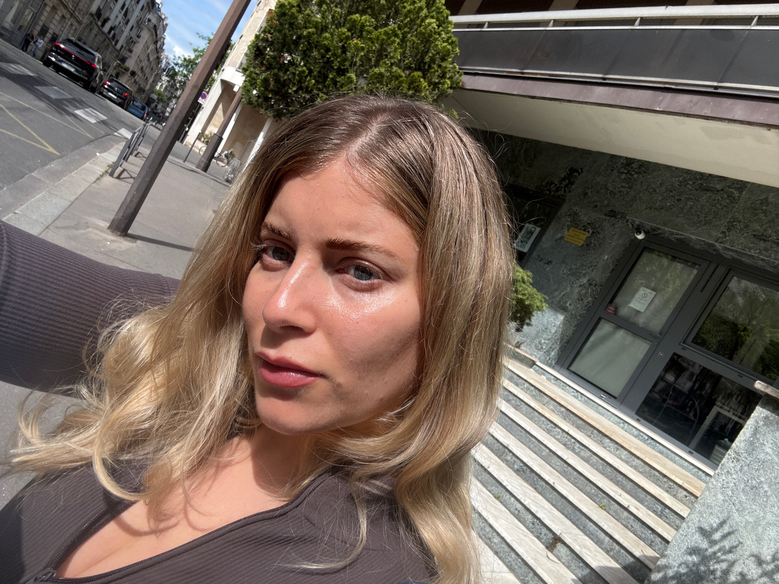 A close-up, upright selfie captures a young woman outdoors in an urban setting, bathed in bright sunlight. The woman, positioned centrally, has long, wavy blonde hair and is wearing a dark gray ribbedβ¦read more