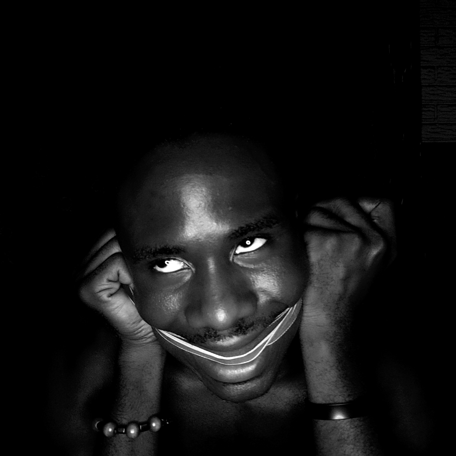 The image is a black and white close-up of a person's face and hands, angled slightly upward. The person appears to be dark-skinned with a shaved head. The eyes are open and looking directly at the vi…read more