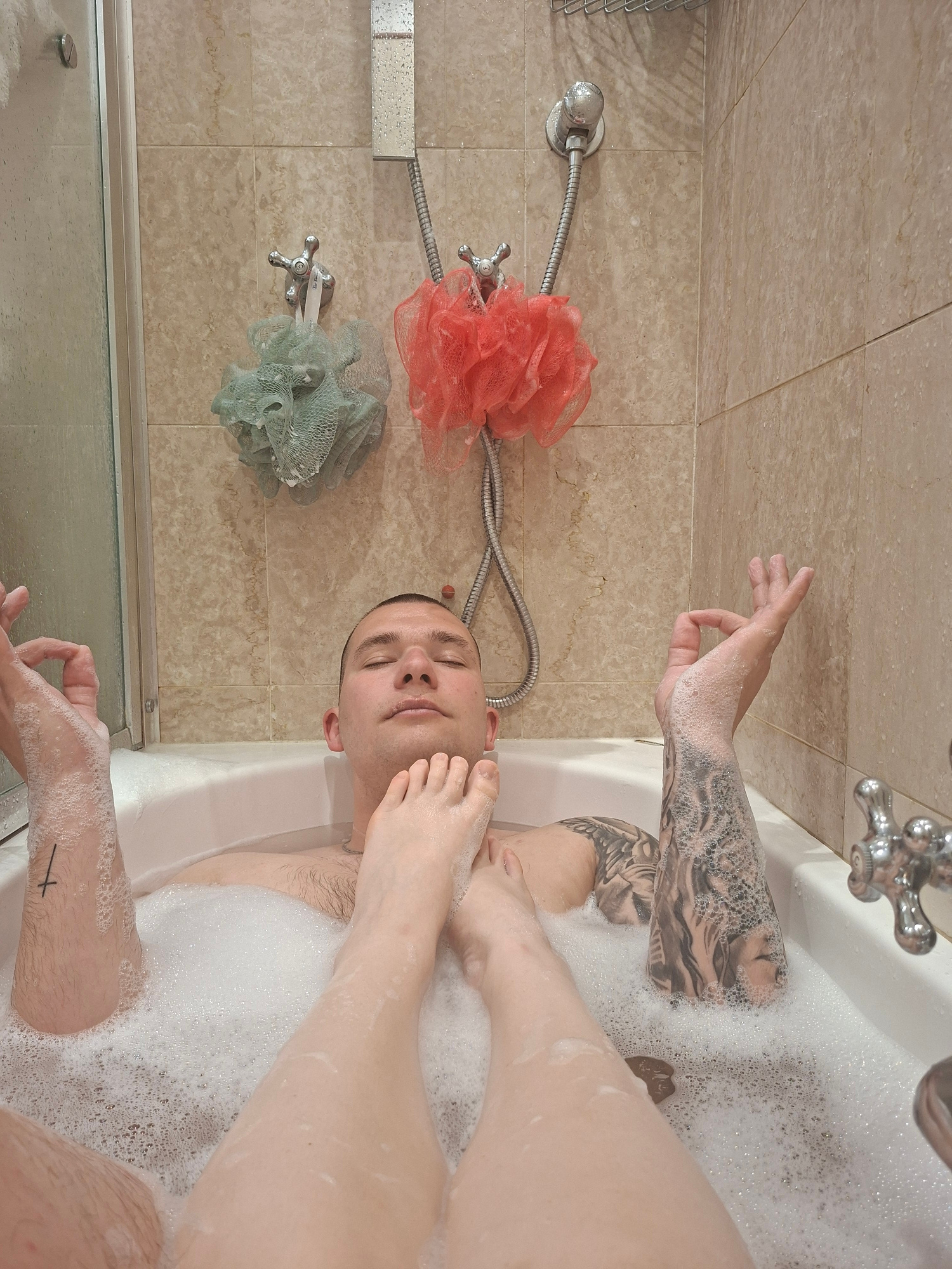 A man is in a bathtub filled with bubbles. Another person’s foot is on the man's face. Both people are tattooed. The scene is indoors in a bathroom. The location is not discernible from the image.