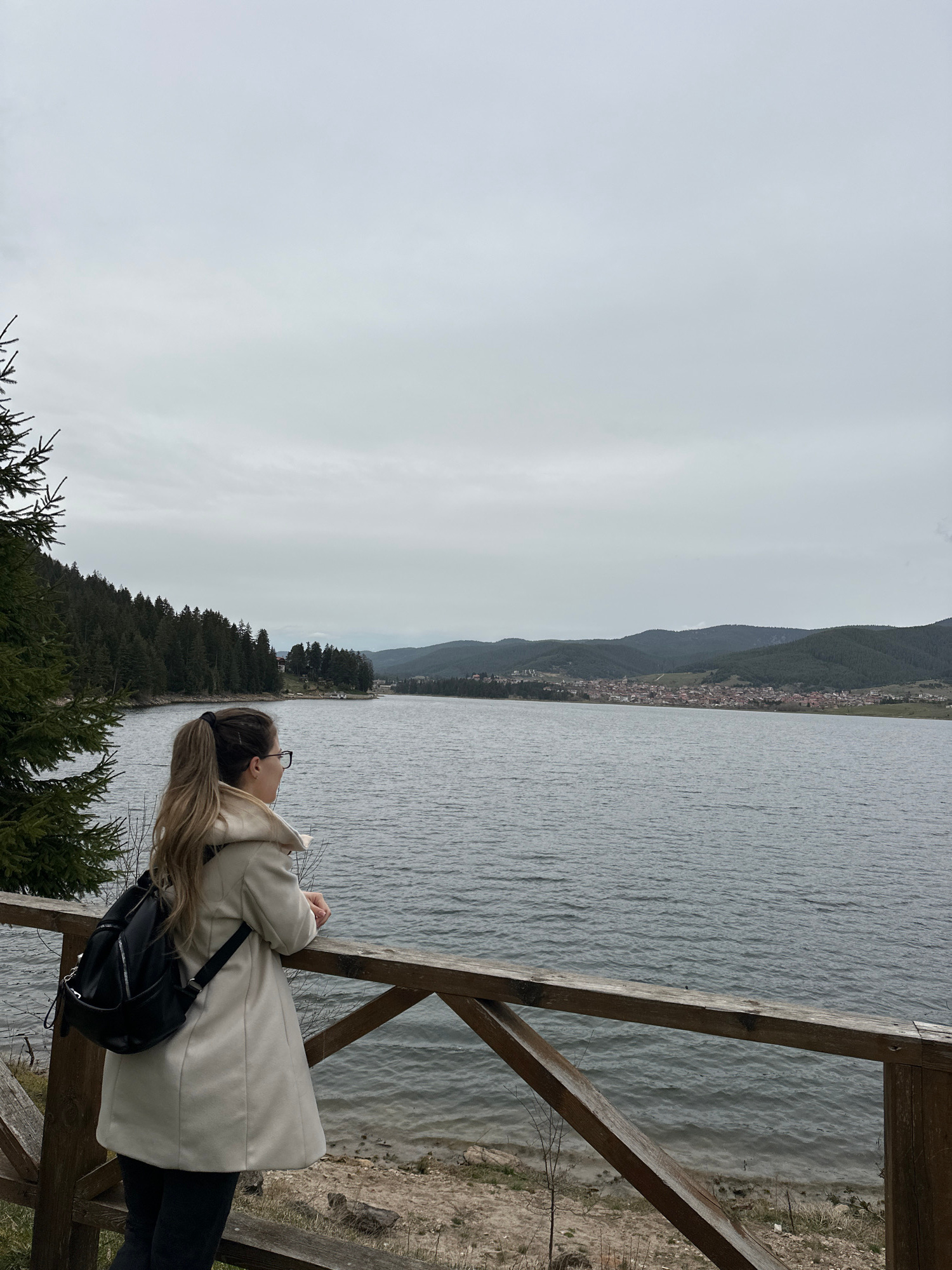 A young woman with long blonde hair tied in a ponytail, wearing glasses, a light-colored (possibly beige or off-white) coat, dark trousers, and a black backpack, stands in profile. She is leaning agai…read more