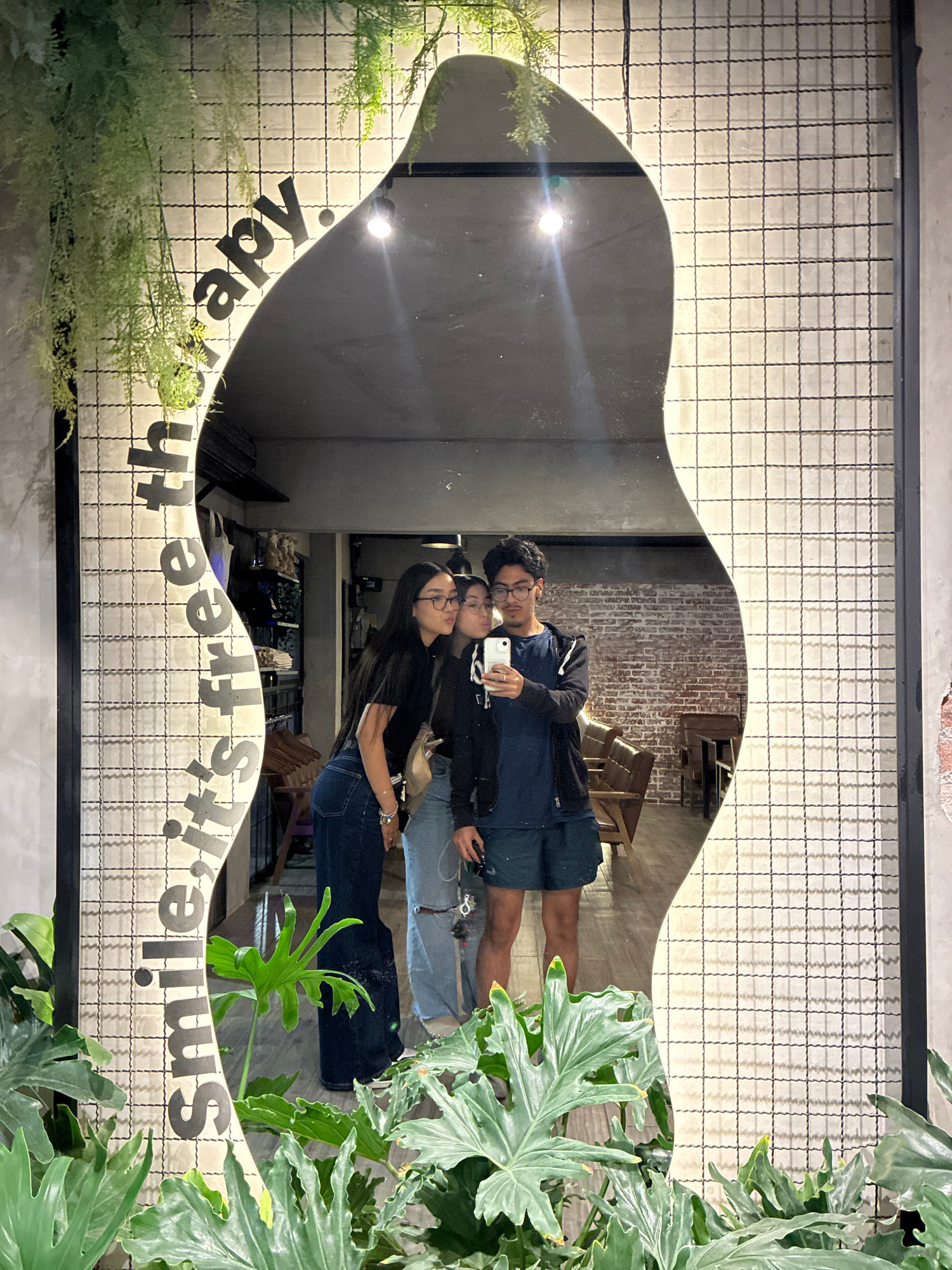The image depicts a couple taking a selfie in front of an ornate mirror. The mirror has a wavy, irregular shape and is framed by a wire grid. The words "smile, it's free therapy" are written along the…read more