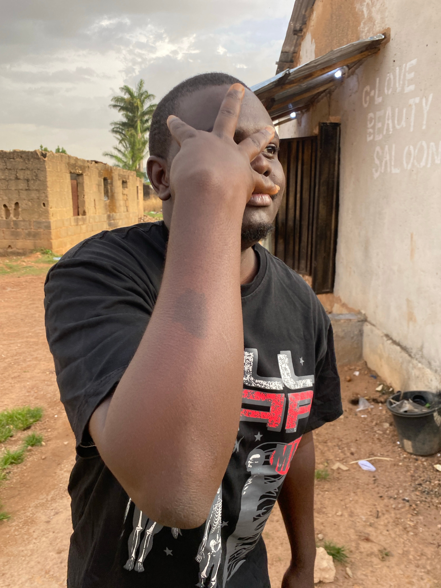 A person with dark skin and a shaved head is outside in Bukuru, Nigeria, posing for a photo. They are wearing a black t-shirt with a design. The person's hand is near their face, partially obscuring i…read more