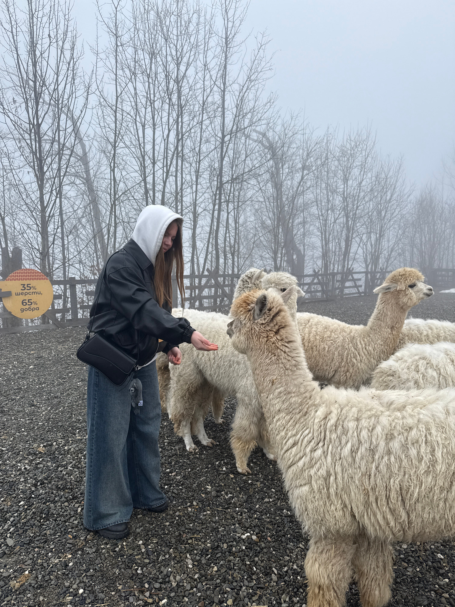 An outdoor scene in Estosadok, Russia, shows a young female hand-feeding alpacas on a foggy day. The ground is composed of dark grey gravel. The female, positioned left of center, wears a white hooded…read more